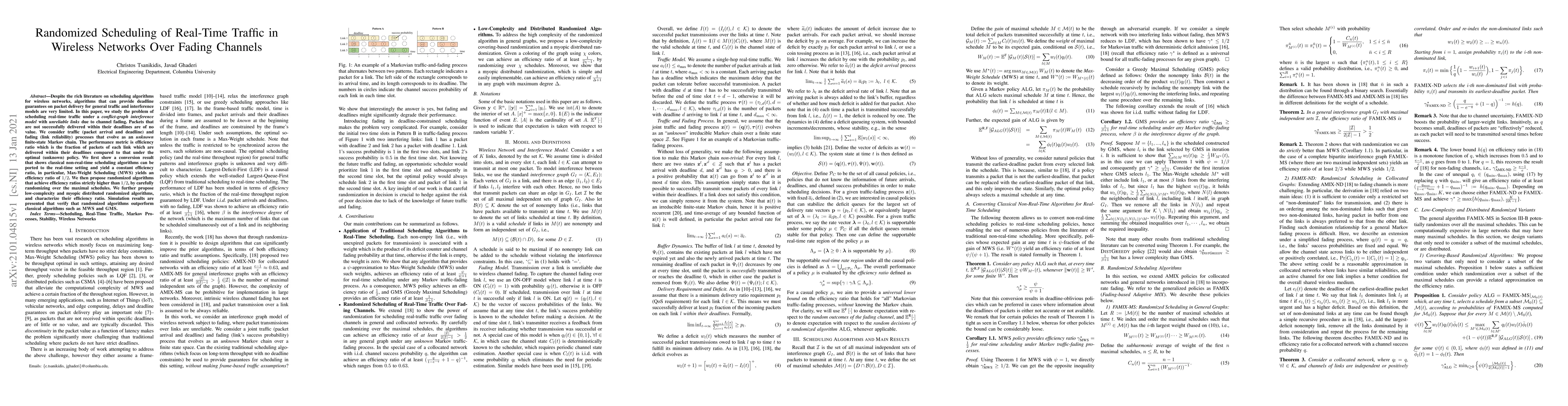 This paper explores scheduling real-time traffic in wireless networks with fading channels, proposing randomized algorithms that achieve better efficiency ratios than classical Max-Weight Scheduling. The study shows that these algorithms can outperform traditional methods in delivering packets within deadlines.