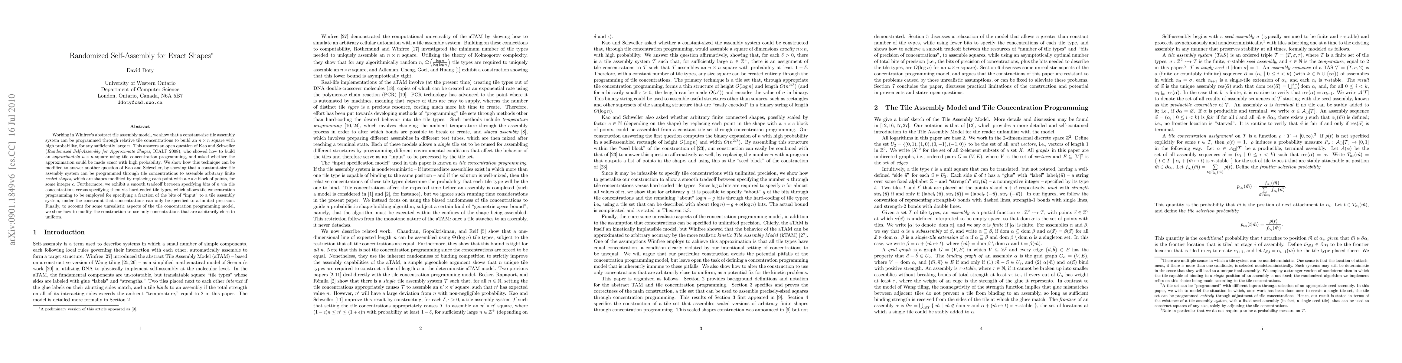 Researchers demonstrate that a constant-size tile assembly system can build exact n x n squares with high probability using relative tile concentrations, answering an open question from 2008.