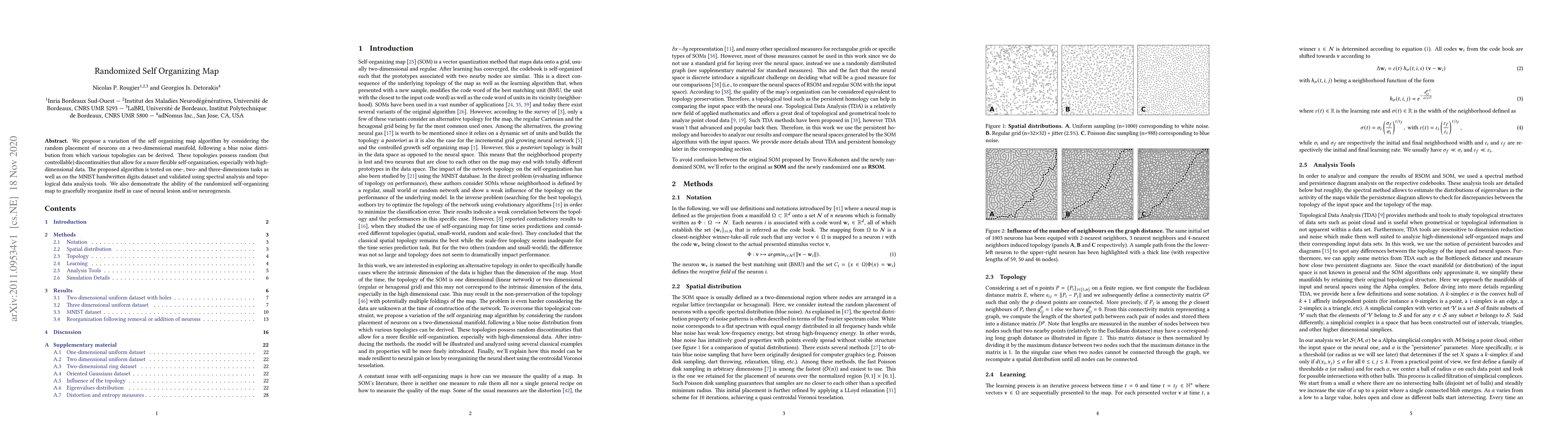 This paper introduces a randomized self-organizing map algorithm that places neurons on a two-dimensional manifold according to a blue noise distribution, enabling flexible self-organization for high-dimensional data. The algorithm is validated through spectral and topological data analysis, and it demonstrates adaptability to neural lesion and neurogenesis.