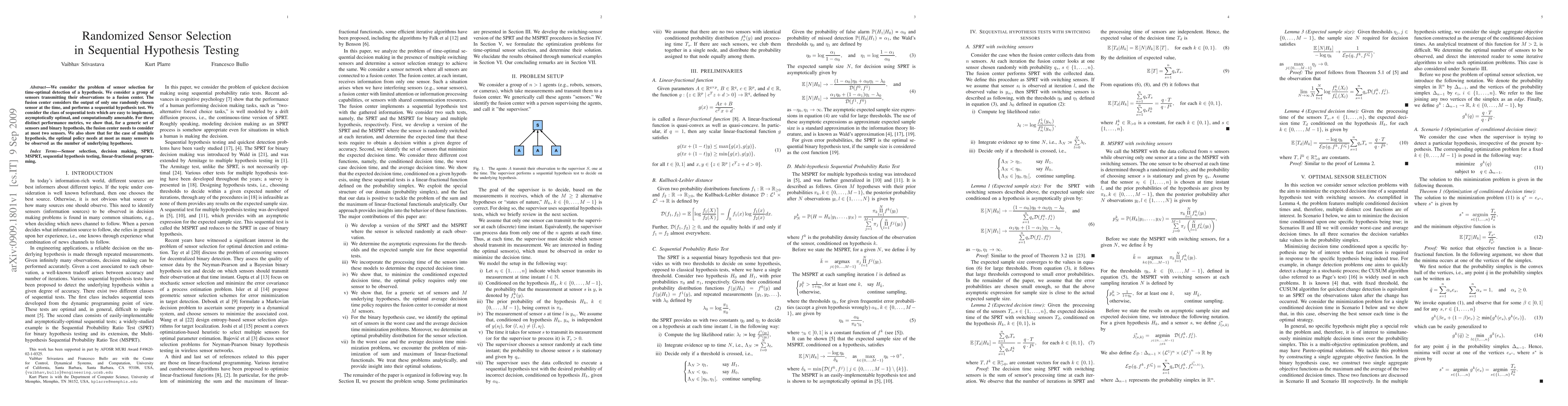 We consider the problem of sensor selection for time-optimal detection of a hypothesis. We consider a group of sensors transmitting their observations to a fusion center. The fusion center considers the output of only one randomly chosen sensor at the time, and performs a sequential hypothesis test. We consider the class of sequential tests which are easy to implement, asymptotically optimal, and computationally amenable. For three distinct performance metrics, we show that, for a generic set of sensors and binary hypothesis, the fusion center needs to consider at most two sensors. We also show that for the case of multiple hypothesis, the optimal policy needs at most as many sensors to be observed as the number of underlying hypotheses.