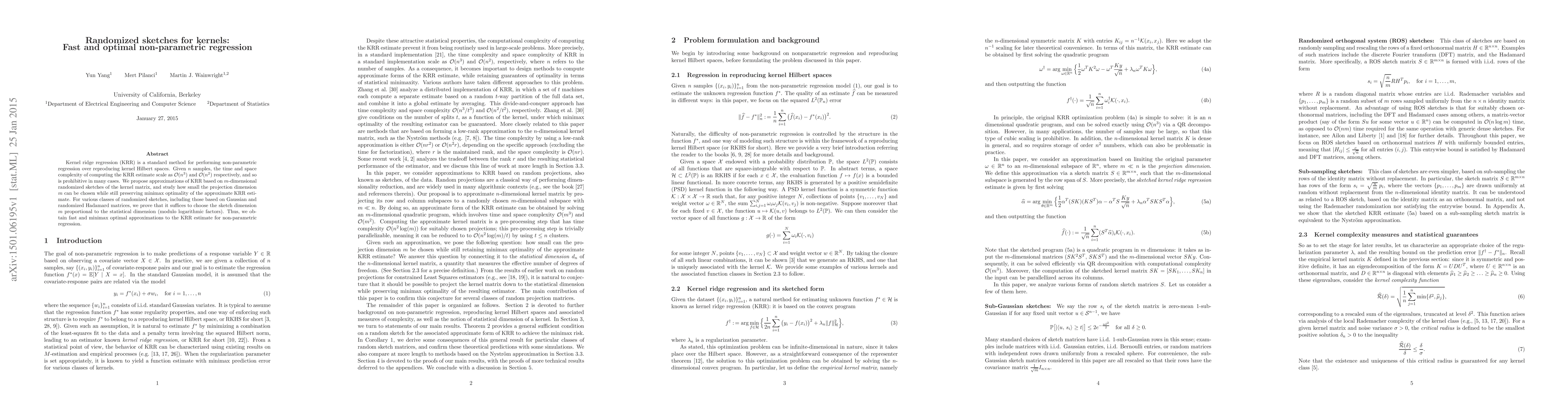 This paper proposes fast approximations for kernel ridge regression (KRR) using randomized sketches of the kernel matrix, achieving optimal performance while significantly reducing computational complexity from $\mathcal{O}(n^3)$ to a dimension-dependent $\mathcal{O}(m^3)$, where $m$ is the sketch dimension.