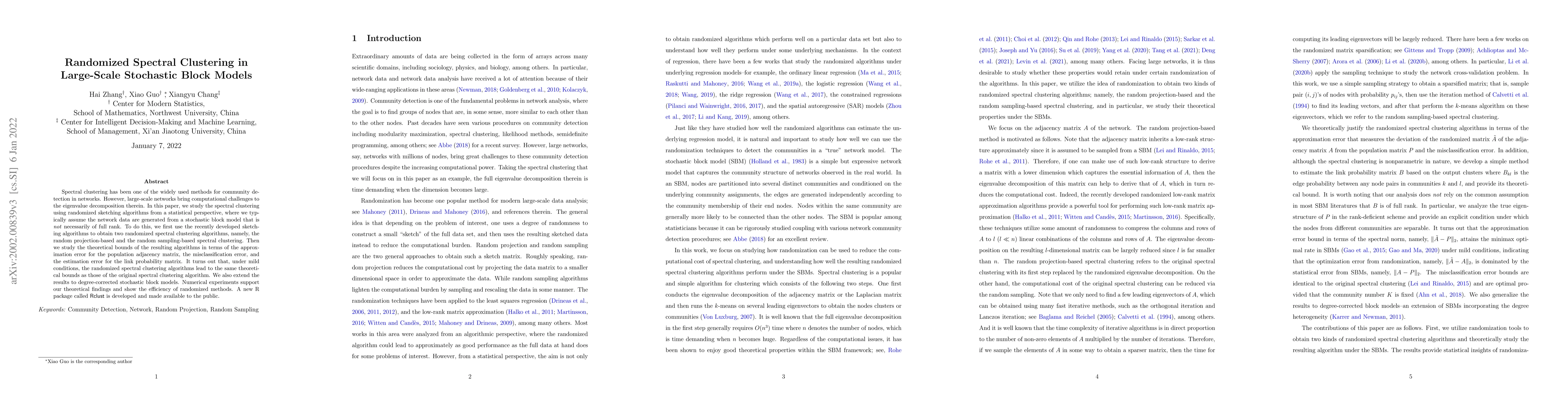 This paper proposes randomized spectral clustering algorithms for community detection in large-scale stochastic block models, demonstrating their theoretical equivalence to traditional methods and presenting an R package, Rclust, for practical implementation. Numerical experiments validate the efficiency and accuracy of the proposed randomized approaches.