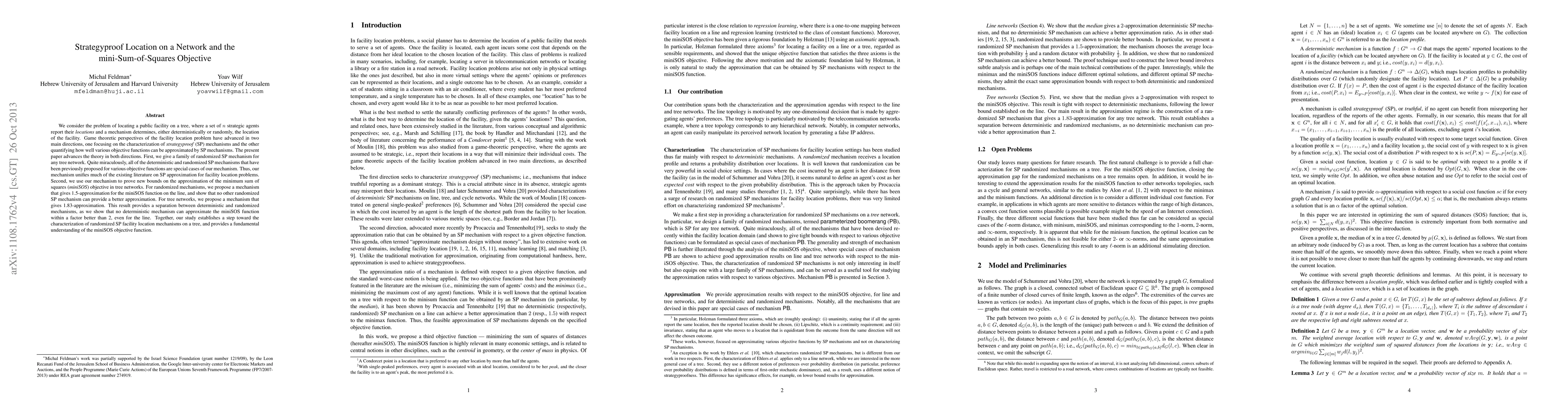 This paper develops a randomized strategyproof mechanism for facility location on a line, showing that it encompasses previous mechanisms as special cases. It provides a 1.5-approximation for minimizing the sum of squares of distances (miniSOS) and proves that no better randomized strategyproof mechanism exists, while the median mechanism offers a tight 2-approximation for deterministic mechanisms.