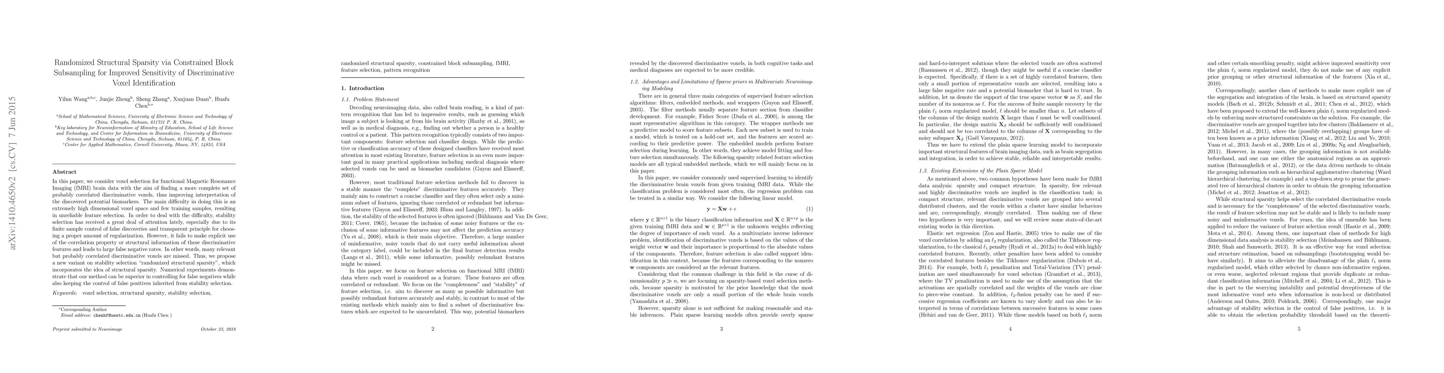 In this paper, we consider voxel selection for functional Magnetic Resonance Imaging (fMRI) brain data with the aim of finding a more complete set of probably correlated discriminative voxels, thus improving interpretation of the discovered potential biomarkers. The main difficulty in doing this is an extremely high dimensional voxel space and few training samples, resulting in unreliable feature selection. In order to deal with the difficulty, stability selection has received a great deal of attention lately, especially due to its finite sample control of false discoveries and transparent principle for choosing a proper amount of regularization. However, it fails to make explicit use of the correlation property or structural information of these discriminative features and leads to large false negative rates. In other words, many relevant but probably correlated discriminative voxels are missed. Thus, we propose a new variant on stability selection "randomized structural sparsity", which incorporates the idea of structural sparsity. Numerical experiments demonstrate that our method can be superior in controlling for false negatives while also keeping the control of false positives inherited from stability selection.