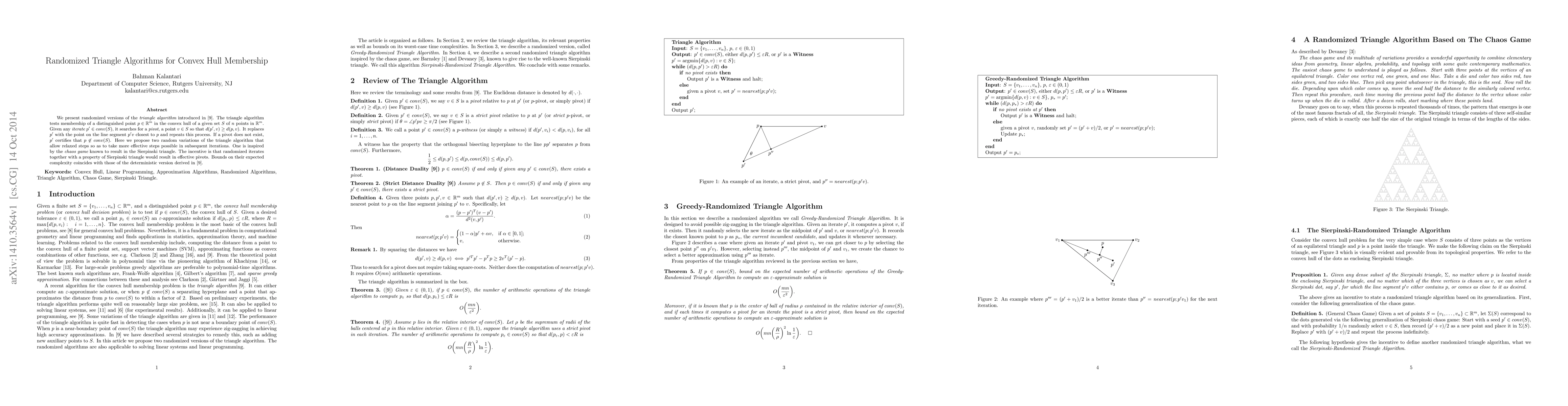 This paper introduces randomized versions of the triangle algorithm to test convex hull membership, proposing two variations inspired by the chaos game and the Sierpinski triangle to enhance pivot selection and efficiency. The expected complexity of these randomized methods matches that of the deterministic version.