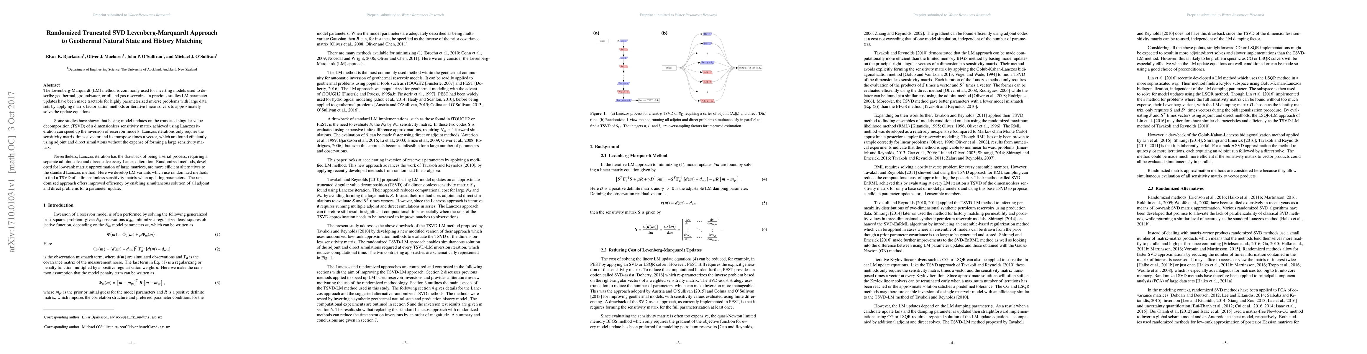 The Levenberg-Marquardt (LM) method is commonly used for inverting models used to describe geothermal, groundwater, or oil and gas reservoirs. In previous studies LM parameter updates have been made tractable for highly parameterized inverse problems with large data sets by applying matrix factorization methods or iterative linear solvers to approximately solve the update equations. Some studies have shown that basing model updates on the truncated singular value decomposition (TSVD) of a dimensionless sensitivity matrix achieved using Lanczos iteration can speed up the inversion of reservoir models. Lanczos iterations only require the sensitivity matrix times a vector and its transpose times a vector, which are found efficiently using adjoint and direct simulations without the expense of forming a large sensitivity matrix. Nevertheless, Lanczos iteration has the drawback of being a serial process, requiring a separate adjoint solve and direct solve every Lanczos iteration. Randomized methods, developed for low-rank matrix approximation of large matrices, are more efficient alternatives to the standard Lanczos method. Here we develop LM variants which use randomized methods to find a TSVD of a dimensionless sensitivity matrix when updating parameters. The randomized approach offers improved efficiency by enabling simultaneous solution of all adjoint and direct problems for a parameter update.