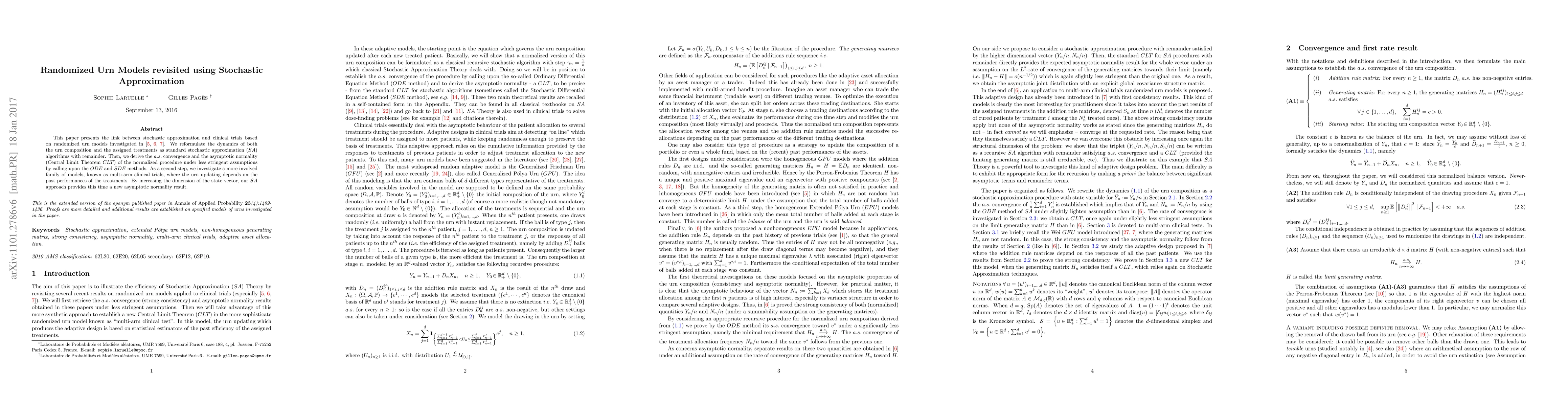 This paper presents the link between stochastic approximation and clinical trials based on randomized urn models investigated in Bai and Hu (1999,2005) and Bai, Hu and Shen (2002). We reformulate the dynamics of both the urn composition and the assigned treatments as standard stochastic approximation (SA) algorithms with remainder. Then, we derive the a.s. convergence and the asymptotic normality (CLT) of the normalized procedure under less stringent assumptions by calling upon the ODE and SDE methods. As a second step, we investigate a more involved family of models, known as multi-arm clinical trials, where the urn updating depends on the past performances of the treatments. By increasing the dimension of the state vector, our SA approach provides this time a new asymptotic normality result.