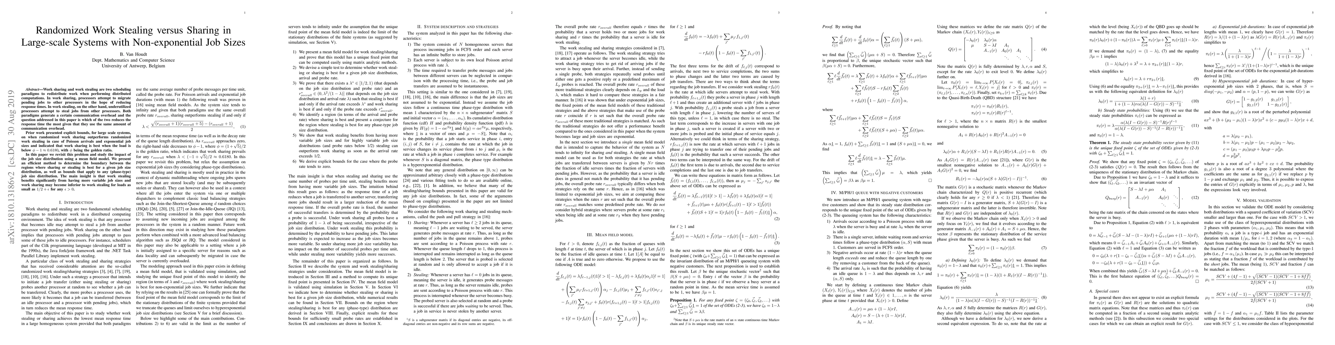 Work sharing and work stealing are two scheduling paradigms to redistribute work when performing distributed computations. In work sharing, processors attempt to migrate pending jobs to other processors in the hope of reducing response times. In work stealing, on the other hand, underutilized processors attempt to steal jobs from other processors. Both paradigms generate a certain communication overhead and the question addressed in this paper is which of the two reduces the response time the most given that they use the same amount of communication overhead. Prior work presented explicit bounds, for large scale systems, on when randomized work sharing outperforms randomized work stealing in case of Poisson arrivals and exponential job durations and indicated that work sharing is best when the load is below $\phi -1 \approx 0.6180$, with $\phi$ being the golden ratio. In this paper we revisit this problem and study the impact of the job size distribution using a mean field model. We present an efficient method to determine the boundary between the regions where sharing or stealing is best for a given job size distribution, as well as bounds that apply to any (phase-type) job size distribution. The main insight is that work stealing benefits significantly from having more variable job sizes and work sharing may become inferior to work stealing for loads as small as $1/2 + \epsilon$ for any $\epsilon > 0$.