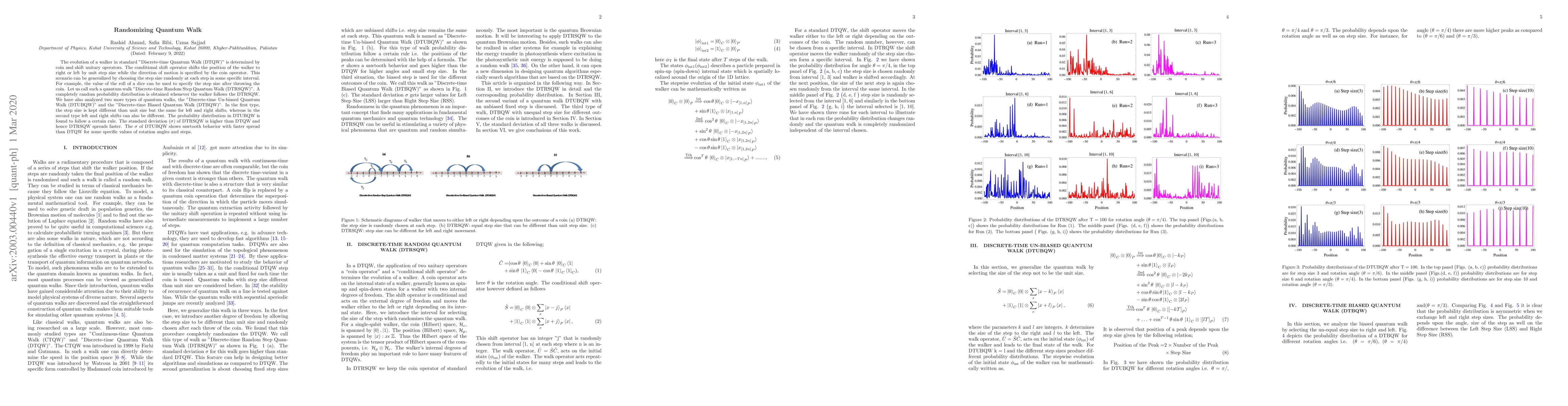 The evolution of a walker in standard "Discrete-time Quantum Walk (DTQW)" is determined by coin and shift unitary operators. The conditional shift operator shifts the position of the walker to right or left by unit step size while the direction of motion is specified by the coin operator. This scenario can be generalized by choosing the step size randomly at each step in some specific interval. For example, the value of the roll of a dice can be used to specify the step size after throwing the coin. Let us call such a quantum walk "Discrete-time Random Step Quantum Walk (DTRSQW)". A completely random probability distribution is obtained whenever the walker follows the DTRSQW. We have also analyzed two more types of quantum walks, the "Discrete-time Un-biased Quantum Walk (DTUBQW)" and the "Discrete-time Biased Quantum Walk (DTBQW)". In the first type, the step size is kept different than unit size but the same for left and right shifts, whereas in the second type left and right shifts can also be different. The probability distribution in DTUBQW is found to follow a certain rule. The standard deviation ($\sigma$) of DTRSQW is higher than DTQW and hence DTRSQW spreads faster. The $\sigma$ of DTUBQW shows sawtooth behavior with faster spread than DTQW for some specific values of rotation angles and steps.