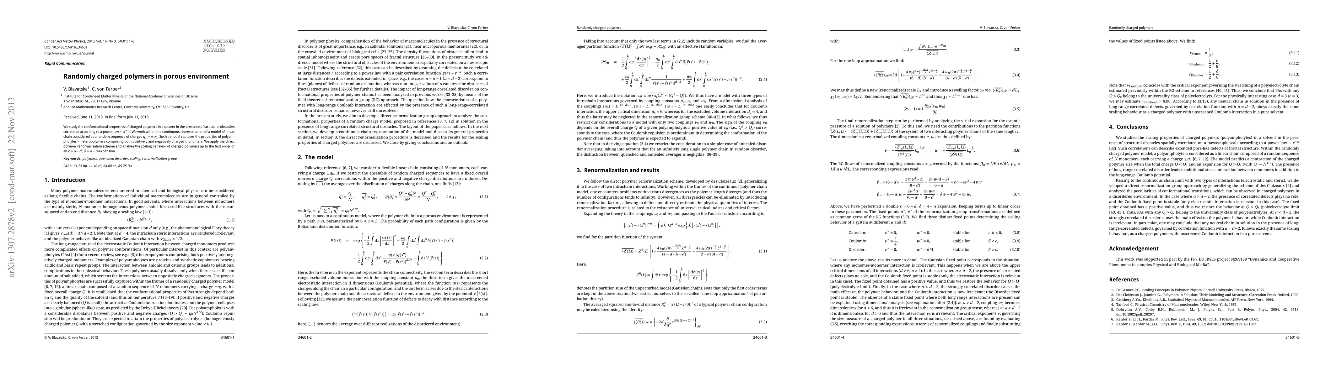 This paper investigates the conformational properties of randomly charged polymers, specifically polyampholytes, in a porous solvent environment with structural obstacles following a power law. The study employs a direct polymer renormalization scheme to analyze the scaling behavior of the polymers, focusing on the first-order $\epsilon$ and $\delta$ expansions.