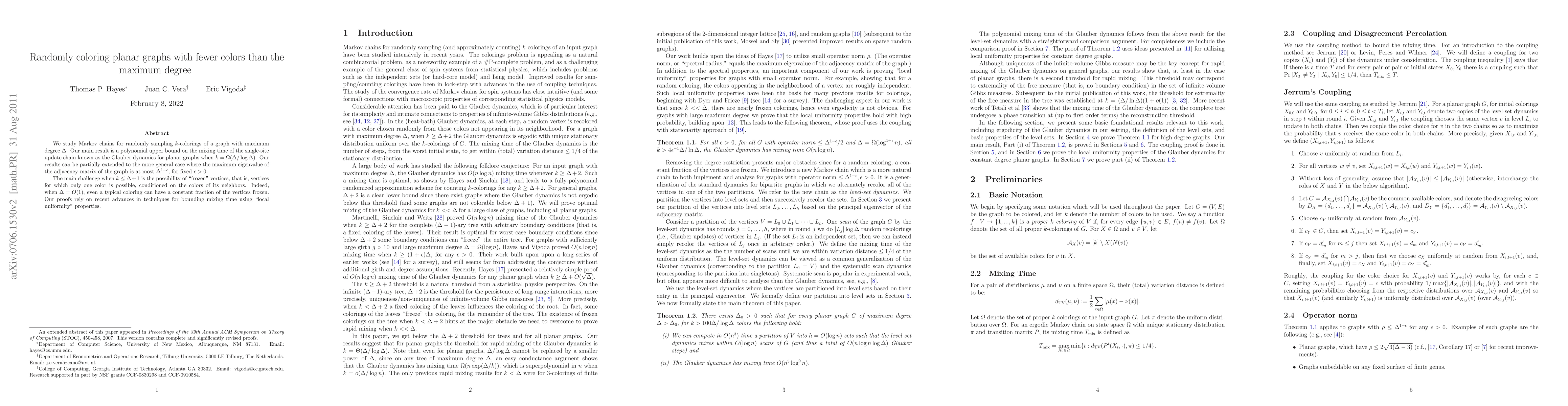 This research presents a polynomial upper bound on the mixing time for randomly coloring planar graphs with k colors, where k is at least Delta log Delta, using Glauber dynamics. The study tackles 'frozen vertices' issue, extending partially to graphs with maximum eigenvalue up to Delta^(1-eps). The proof leverages recent 'local uniformity' techniques.