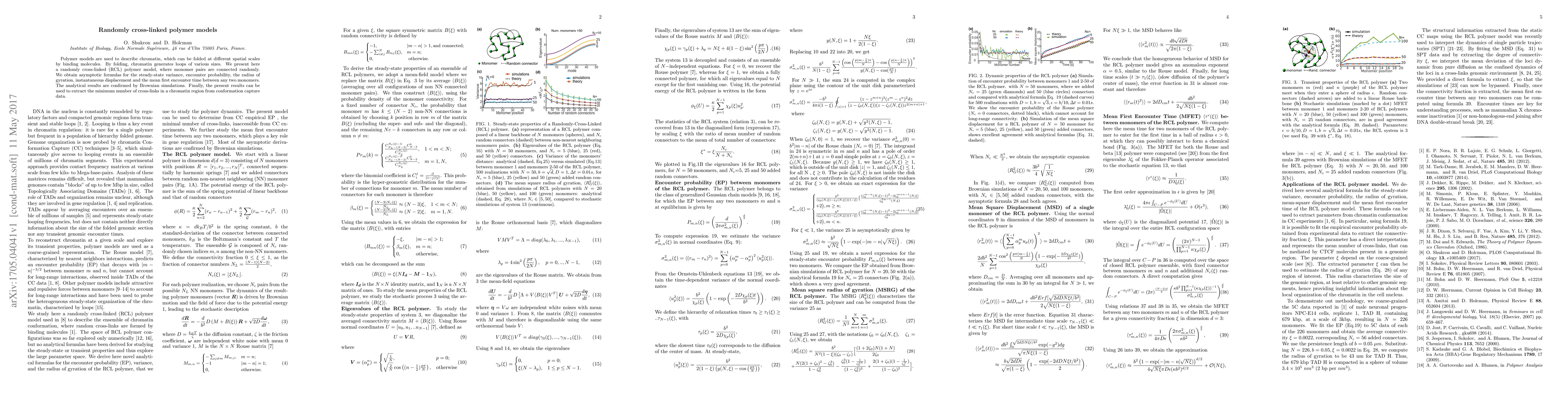 Polymer models are used to describe chromatin, which can be folded at different spatial scales by binding molecules. By folding, chromatin generates loops of various sizes. We present here a randomly cross-linked (RCL) polymer model, where monomer pairs are connected randomly. We obtain asymptotic formulas for the steady-state variance, encounter probability, the radius of gyration, instantaneous displacement and the mean first encounter time between any two monomers. The analytical results are confirmed by Brownian simulations. Finally, the present results can be used to extract the minimum number of cross-links in a chromatin region from {conformation capture} data.