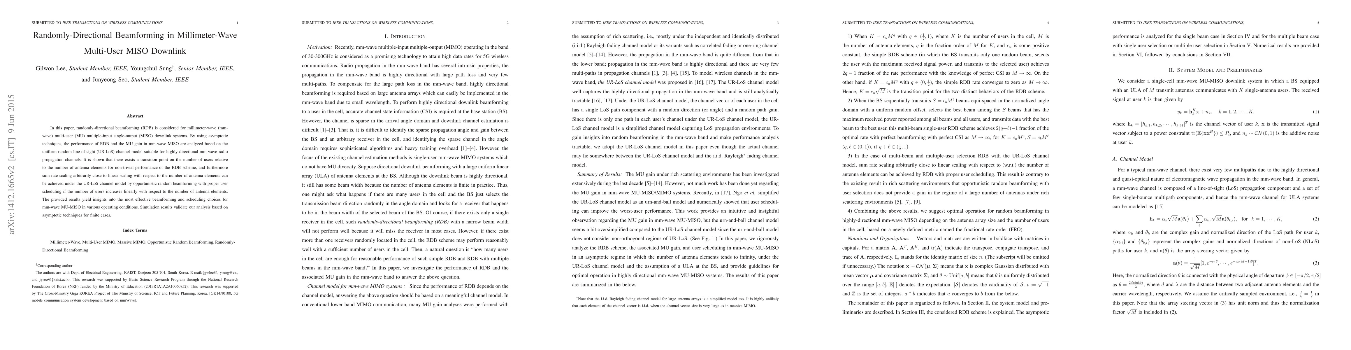 This paper analyzes the performance of randomly-directional beamforming in millimeter-wave multi-user MISO downlink systems, revealing a transition point for effective RDB and demonstrating near-linear scaling of sum rate with antenna elements under a uniform random line-of-sight channel model. Simulation results confirm the theoretical findings.