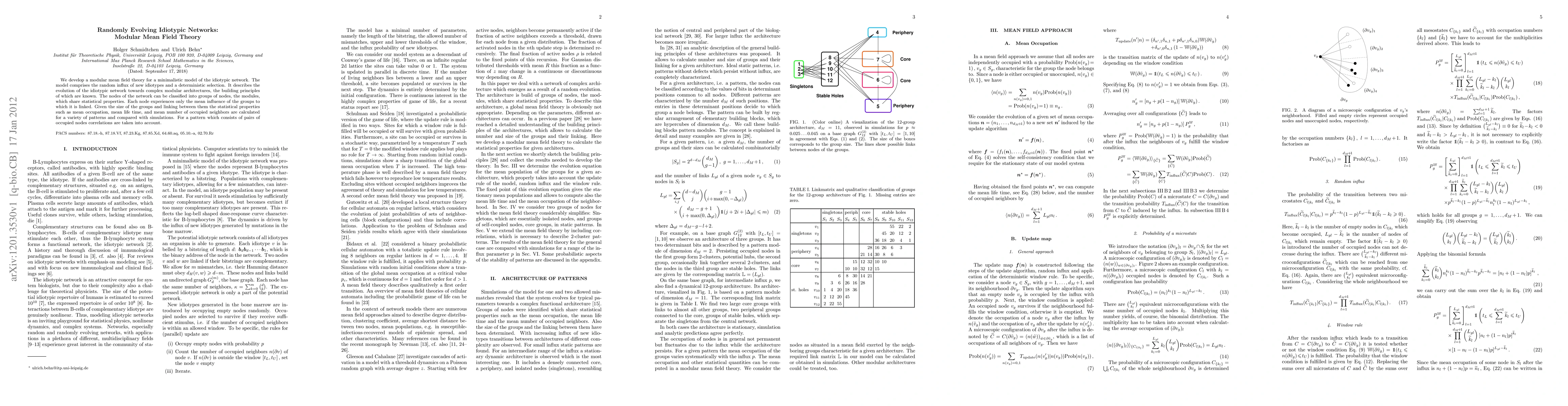 We develop a modular mean field theory for a minimalistic model of the idiotypic network. The model comprises the random influx of new idiotypes and a deterministic selection. It describes the evolution of the idiotypic network towards complex modular architectures, the building principles of which are known. The nodes of the network can be classified into groups of nodes, the modules, which share statistical properties. Each node experiences only the mean influence of the groups to which it is linked. Given the size of the groups and linking between them the statistical properties such as mean occupation, mean life time, and mean number of occupied neighbors are calculated for a variety of patterns and compared with simulations. For a pattern which consists of pairs of occupied nodes correlations are taken into account.