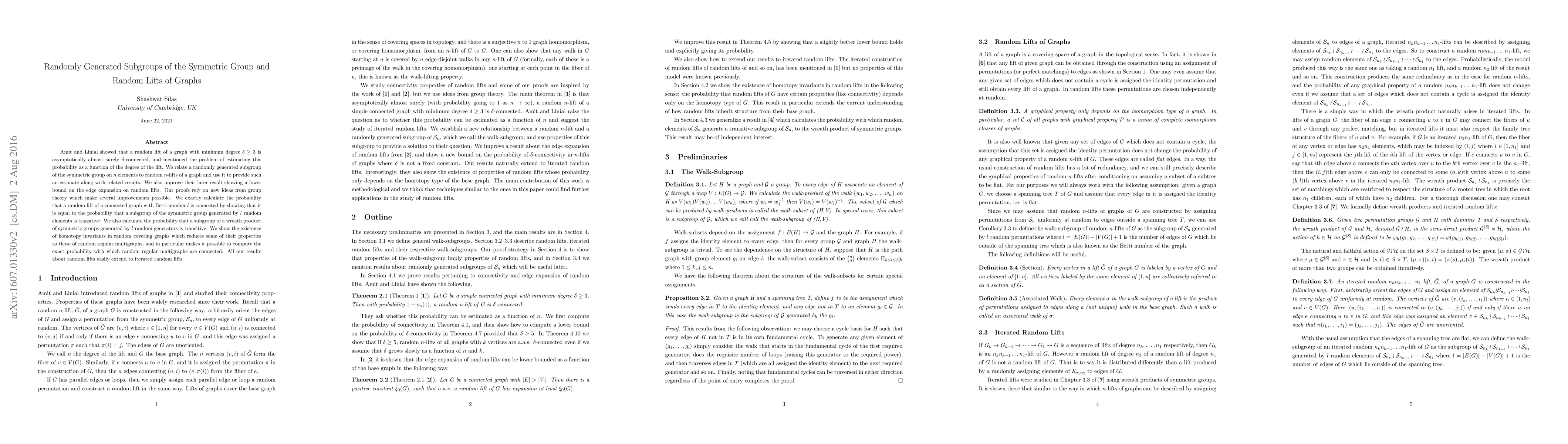 This paper connects randomly generated subgroups of the symmetric group to the properties of random lifts of graphs, providing estimates for the probability of connectivity in these lifts. It uses new group theory insights to calculate exact probabilities of connectivity in random lifts and related covering graphs, extending these results to iterated random lifts.