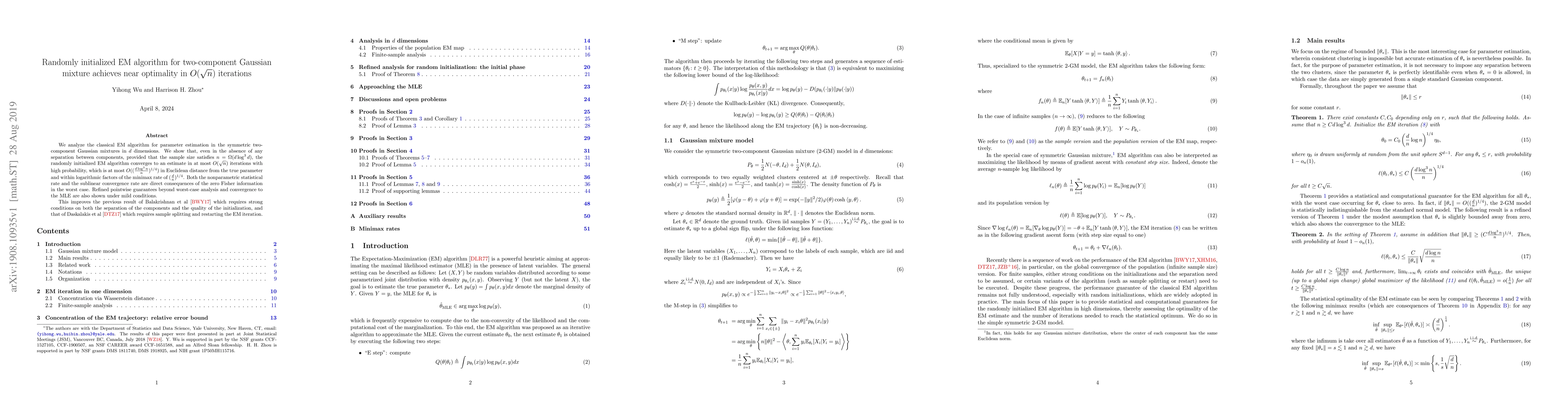 This paper demonstrates that the randomly initialized EM algorithm for estimating parameters in two-component Gaussian mixtures converges to near-optimal estimates in $O(\sqrt{n})$ iterations, even without component separation, provided the sample size is sufficiently large relative to the dimension. The convergence rate and statistical accuracy improve upon previous results by requiring fewer conditions and avoiding sample splitting or restarting.