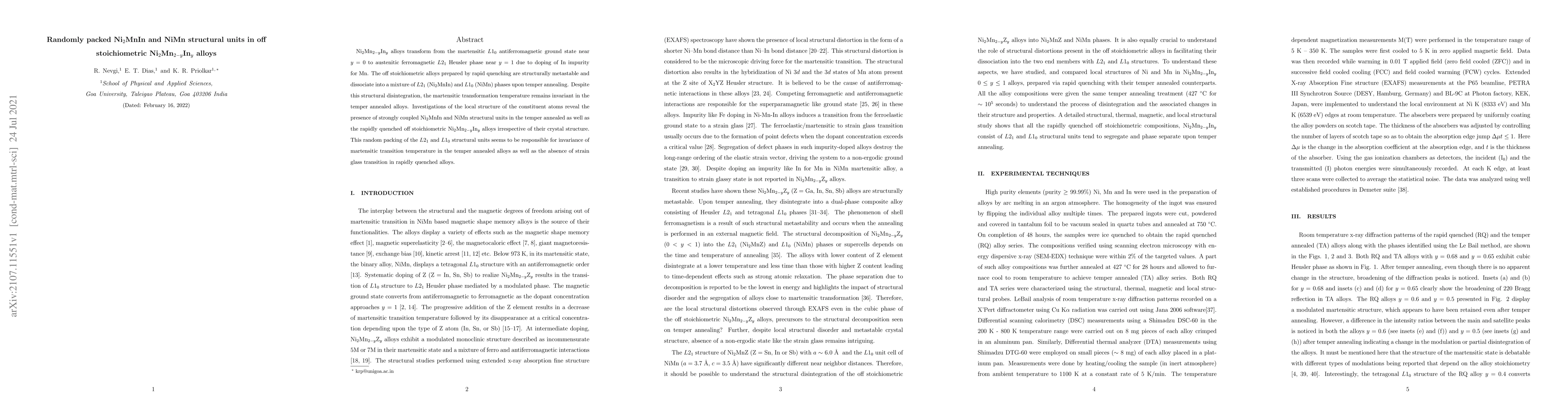 This study investigates off stoichiometric Ni$_2$Mn$_{2-y}$In$_y$ alloys, revealing that they transform from martensitic to austenitic phases due to In doping. Despite structural disintegration upon annealing, the martensitic transformation temperature remains constant, attributed to the random packing of $L2_1$ (Ni$_2$MnIn) and $L1_0$ (NiMn) structural units.
