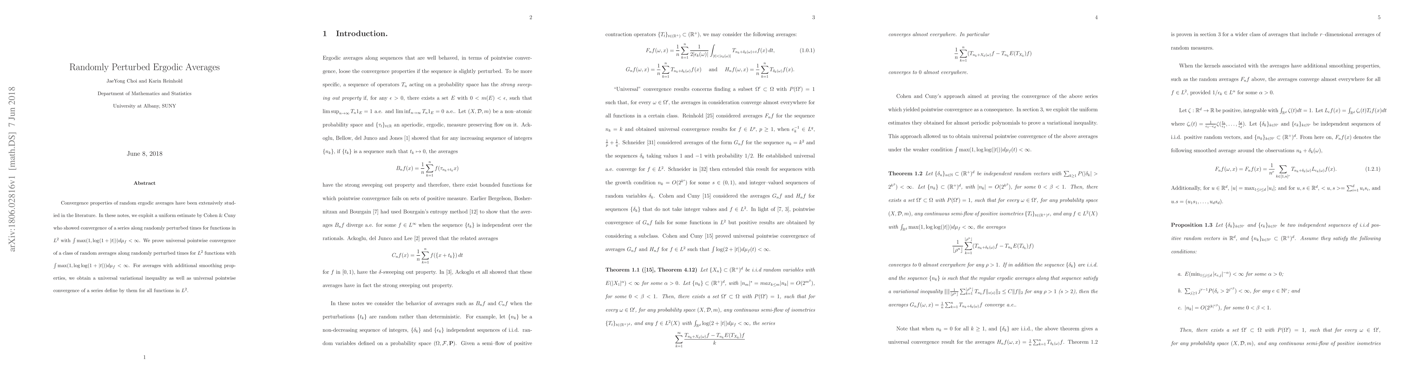 Convergence properties of random ergodic averages have been extensively studied in the literature. In these notes, we exploit a uniform estimate by Cohen \& Cuny who showed convergence of a series along randomly perturbed times for functions in $L^2$ with $\int \max(1,\log (1+|t|)) d\mu_f<\infty$. We prove universal pointwise convergence of a class of random averages along randomly perturbed times for $L^2$ functions with $\int \max(1,\log\log(1+|t|)) d\mu_f<\infty$. For averages with additional smoothing properties, we obtain a universal variational inequality as well as universal pointwise convergence of a series define by them for all functions in $L^2$.