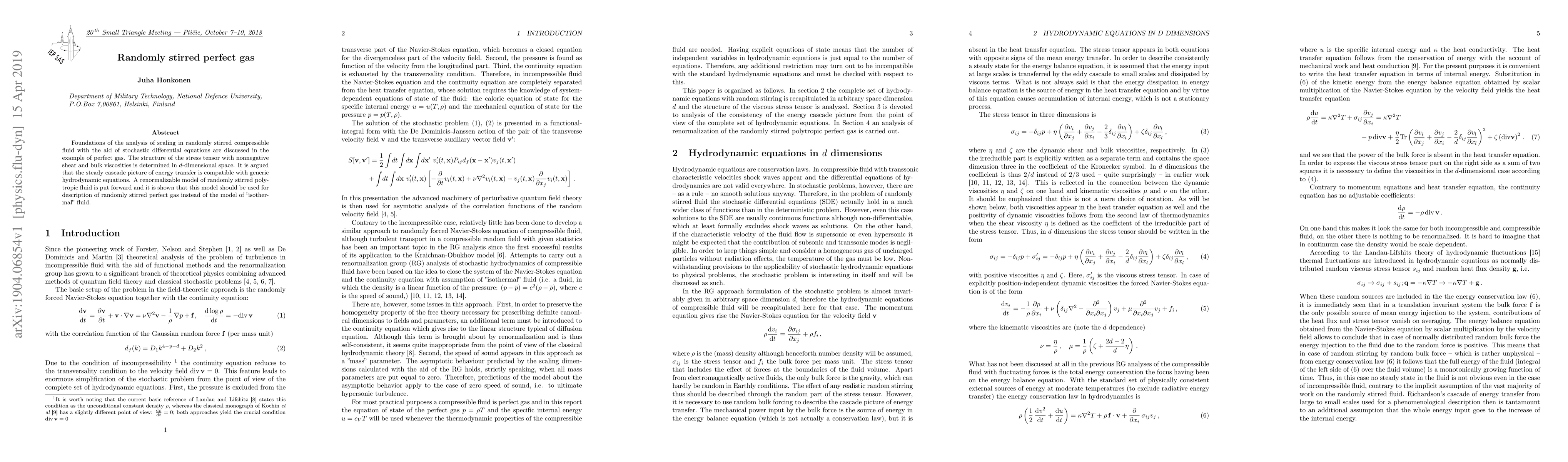 Foundations of the analysis of scaling in randomly stirred compressible fluid with the aid of stochastic differential equations are discussed in the example of perfect gas. The structure of the stress tensor with nonnegative shear and bulk viscosities is determined in $d$-dimensional space. It is argued that the steady cascade picture of energy transfer is compatible with generic hydrodynamic equations. A renormalizable model of randomly stirred polytropic fluid is put forward and it is shown that this model should be used for description of randomly stirred perfect gas instead of the model of 'isothermal' fluid.