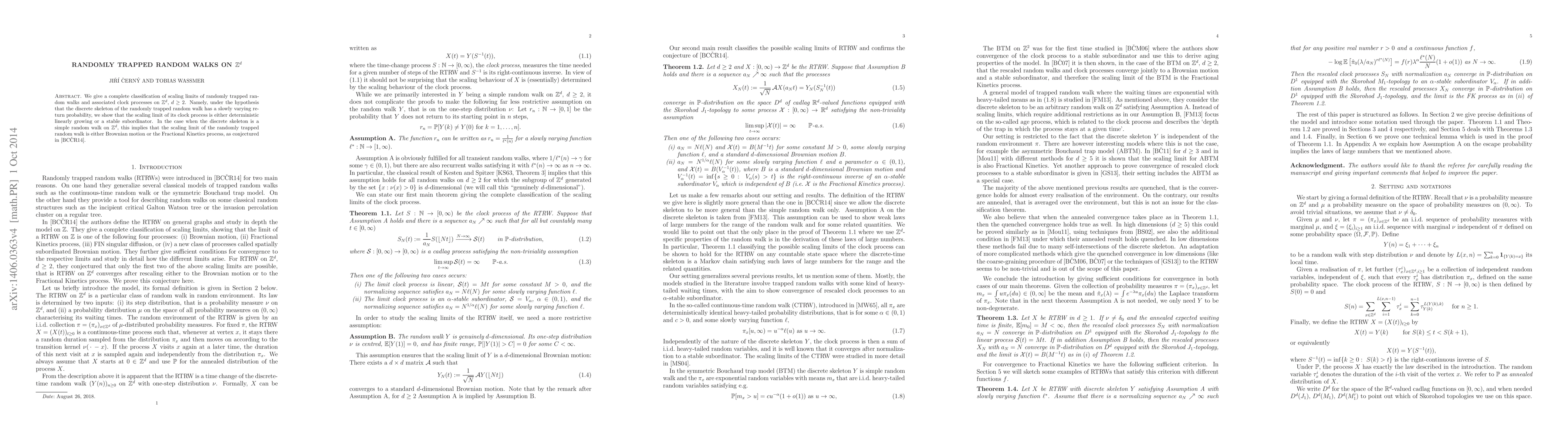 This paper classifies the scaling limits of randomly trapped random walks on $\mathbb Z^d$, showing that the clock process's limit is either deterministically linear or a stable subordinator, confirming the conjectured limits for Brownian motion or Fractional Kinetics processes.