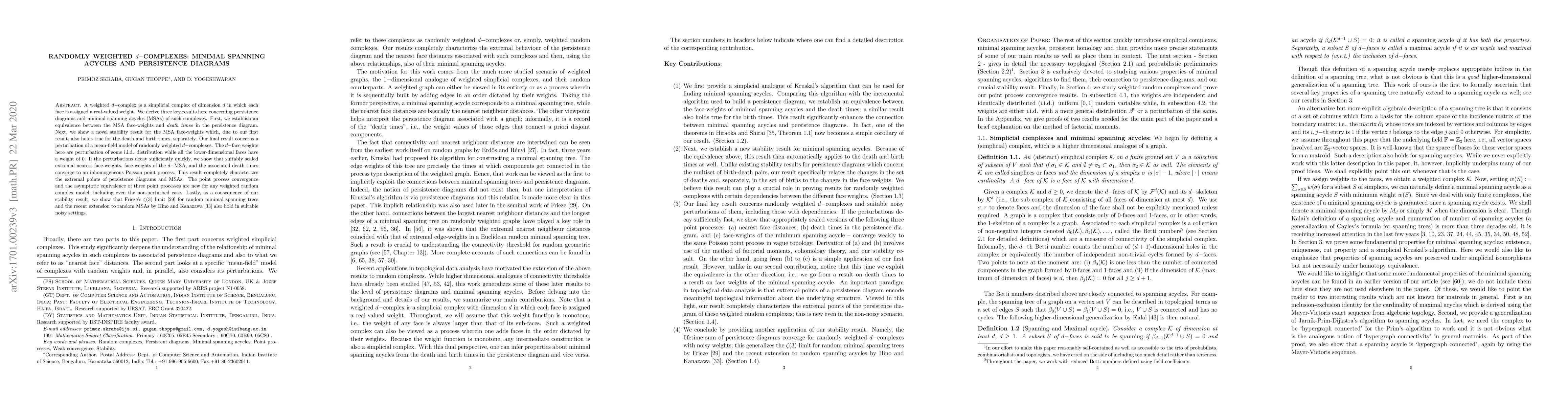 This paper investigates weighted $d-$complexes, establishing an equivalence between minimal spanning acycles (MSAs) face-weights and persistence diagram death times. It also proves a stability result for MSA face-weights and demonstrates convergence of extremal face-weights and death times to an inhomogeneous Poisson point process under certain perturbation conditions.