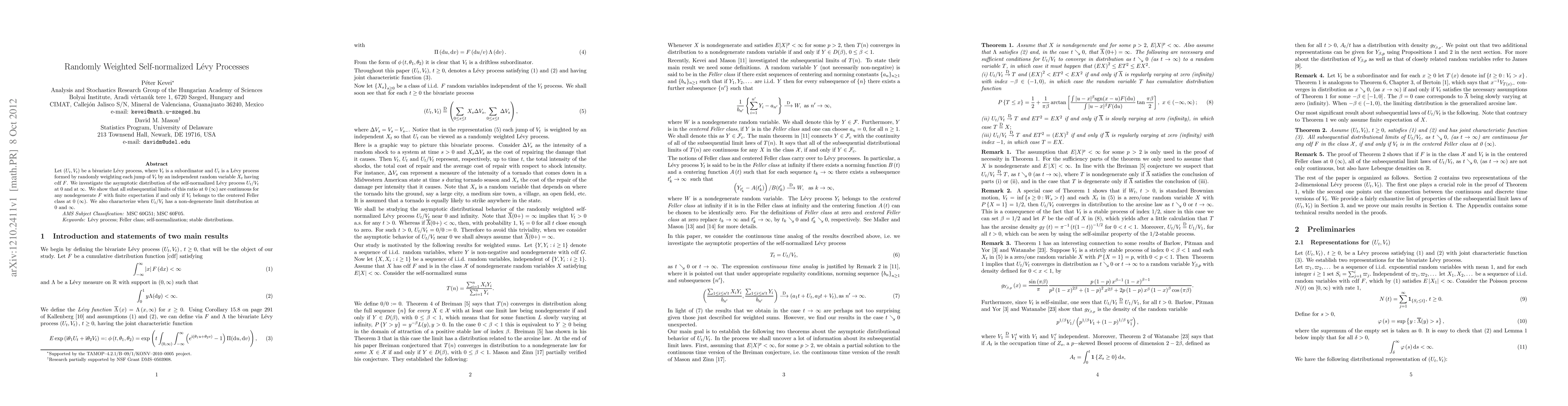 This paper studies the asymptotic behavior of a self-normalized Lévy process $U_t/V_t$, where $U_t$ is a Lévy process formed by weighting each jump of a subordinator $V_t$ with independent random variables. The authors prove that the ratio has continuous subsequential limits if $V_t$ is in the centered Feller class, and characterize conditions for non-degenerate limit distributions.