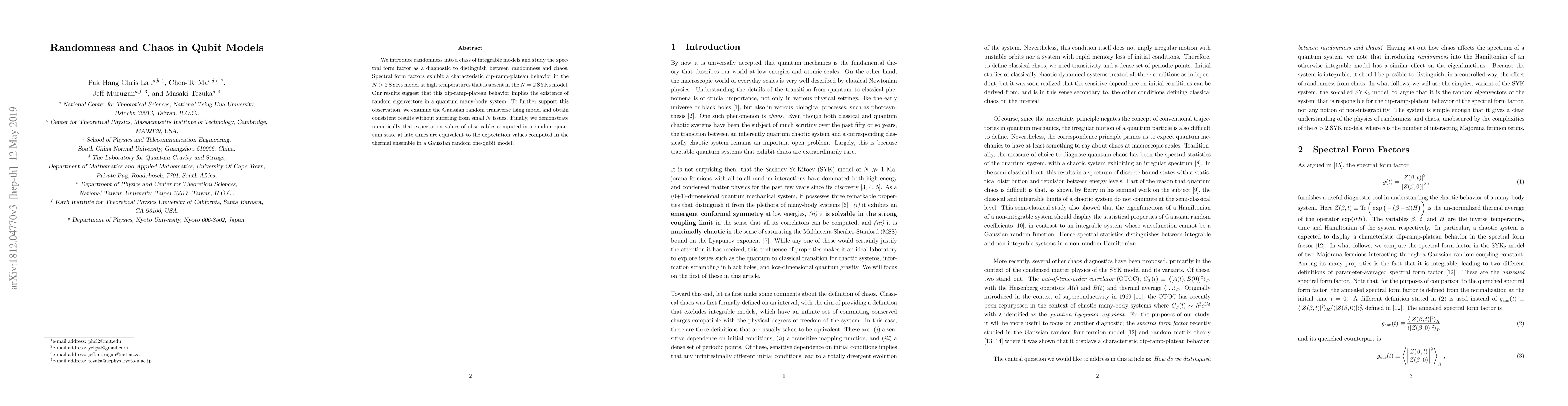 We introduce randomness into a class of integrable models and study the spectral form factor as a diagnostic to distinguish between randomness and chaos. Spectral form factors exhibit a characteristic dip-ramp-plateau behavior in the $N>2$ SYK$_2$ model at high temperatures that is absent in the $N=2$ SYK$_2$ model. Our results suggest that this dip-ramp-plateau behavior implies the existence of random eigenvectors in a quantum many-body system. To further support this observation, we examine the Gaussian random transverse Ising model and obtain consistent results without suffering from small $N$ issues. Finally, we demonstrate numerically that expectation values of observables computed in a random quantum state at late times are equivalent to the expectation values computed in the thermal ensemble in a Gaussian random one-qubit model.