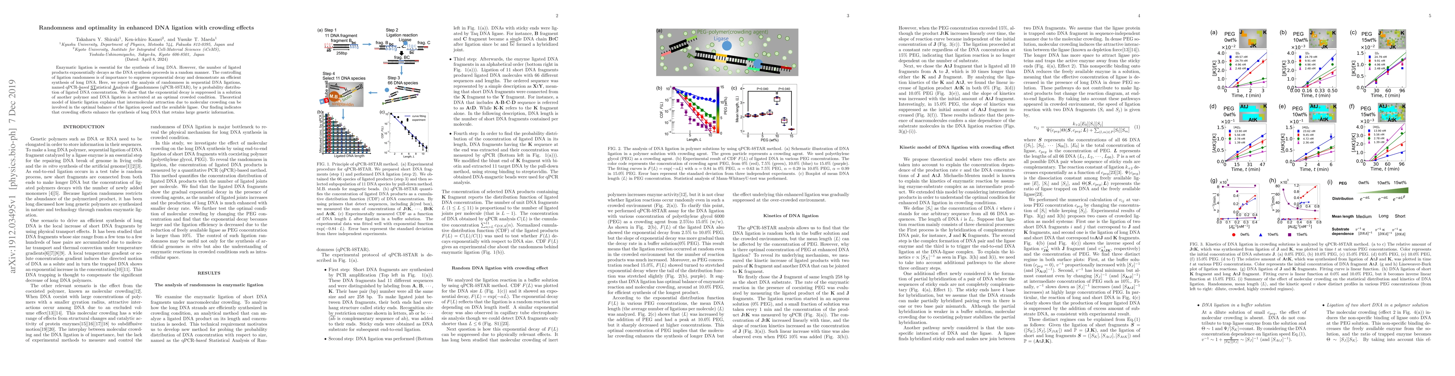 Enzymatic ligation is essential for the synthesis of long DNA. However, the number of ligated products exponentially decays as the DNA synthesis proceeds in a random manner. The controlling of ligation randomness is of importance to suppress exponential decay and demonstrate an efficient synthesis of long DNA. Here, we report the analysis of randomness in sequential DNA ligations, named qPCR-based STatistical Analysis of Randomness (qPCR-bSTAR), by a probability distribution of ligated DNA concentration. We show that the exponential decay is suppressed in a solution of another polymer and DNA ligation is activated at an optimal crowded condition. Theoretical model of kinetic ligation explains that intermolecular attraction due to molecular crowding can be involved in the optimal balance of the ligation speed and the available ligase. Our finding indicates that crowding effects enhance the synthesis of long DNA that retains large genetic information.