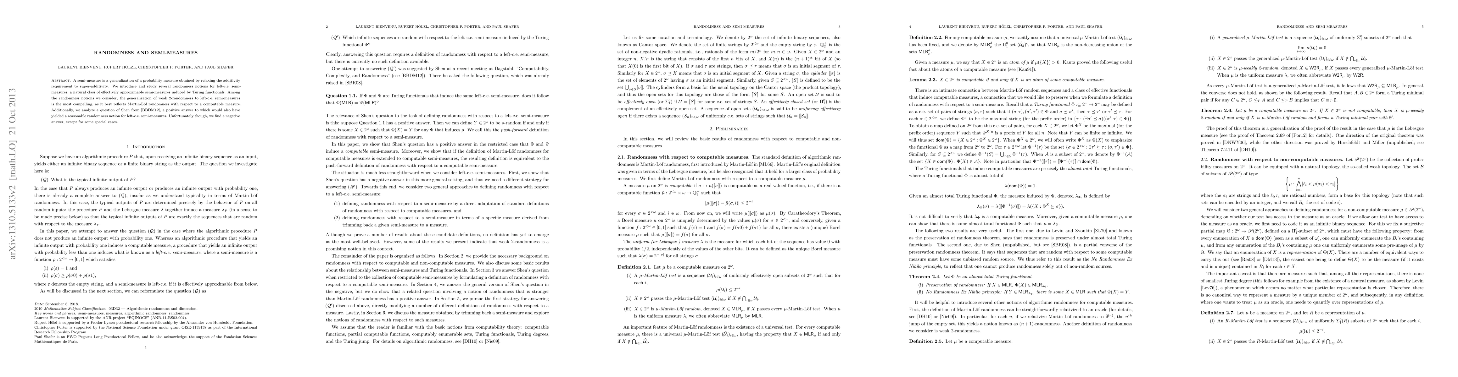 This paper explores randomness notions for left-c.e. semi-measures, generalizing probability measures by relaxing additivity to super-additivity. It introduces a compelling generalization of weak 2-randomness that aligns with Martin-Löf randomness, but finds a negative answer to Shen's question regarding a broader randomness notion, except in specific cases.