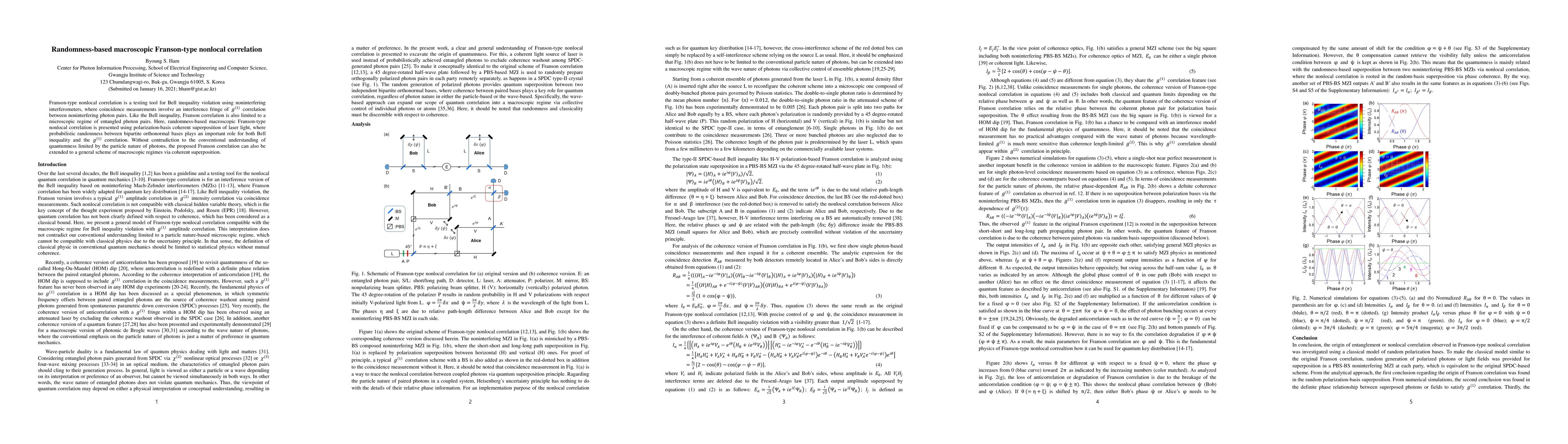 This paper introduces a randomness-based macroscopic Franson-type nonlocal correlation using coherent laser light, extending the Franson correlation beyond the microscopic regime of entangled photons. It leverages probabilistic randomness in polarization-basis superposition to achieve Bell inequality violation and g^((1)) correlation without contradicting the quantum nature of photons.