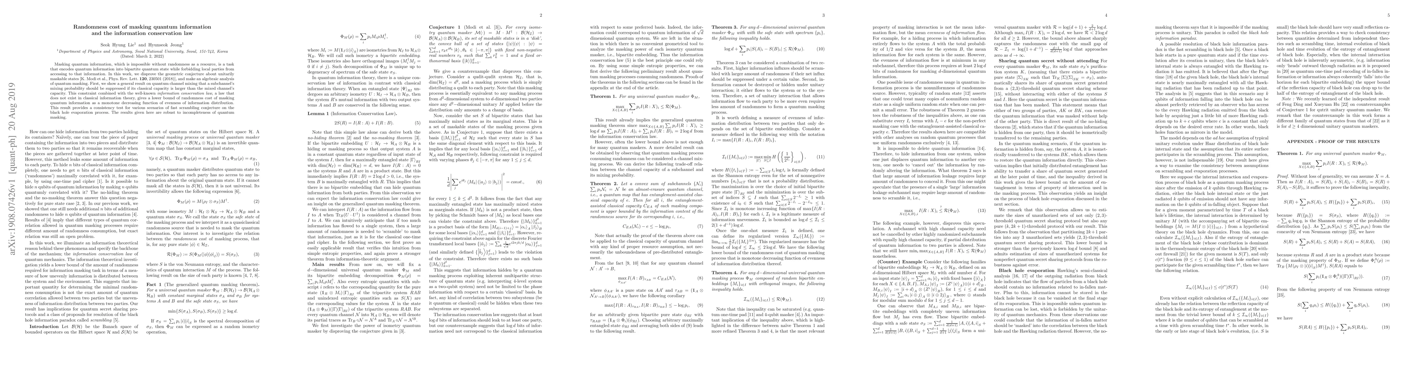 Masking quantum information, which is impossible without randomness as a resource, is a task that encodes quantum information into bipartite quantum state while forbidding local parties from accessing to that information. In this work, we disprove the geometric conjecture about unitarily maskable states [K. Modi et al., Phys. Rev. Lett. 120, 230501 (2018)], and make an algebraic analysis of quantum masking. First, we show a general result on quantum channel mixing that a subchannel's mixing probability should be suppressed if its classical capacity is larger than the mixed channel's capacity. This constraint combined with the well-known information conservation law, a law that does not exist in classical information theory, gives a lower bound of randomness cost of masking quantum information as a monotone decreasing function of evenness of information distribution. This result provides a consistency test for various scenarios of fast scrambling conjecture on the black hole evaporation process. The results given here are robust to incompleteness of quantum masking.