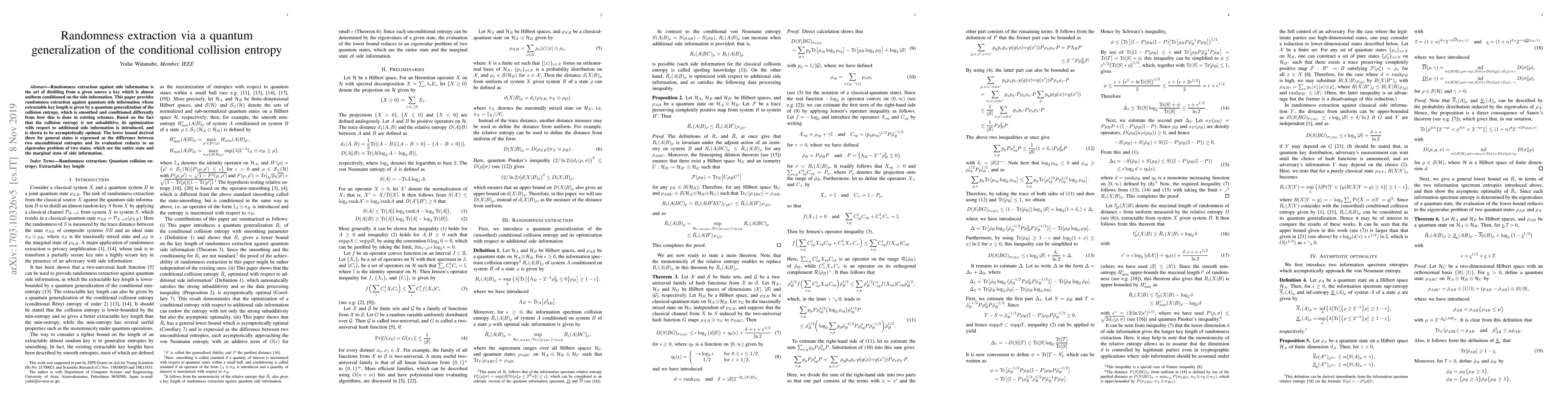 This paper presents a novel method for randomness extraction using quantum side information, where the key length is determined by a quantum generalization of the collision entropy. The proposed scheme optimizes this non-subadditive entropy, demonstrating asymptotic optimality and reducing evaluation to an eigenvalue problem involving the entire state and the marginal state of side information.