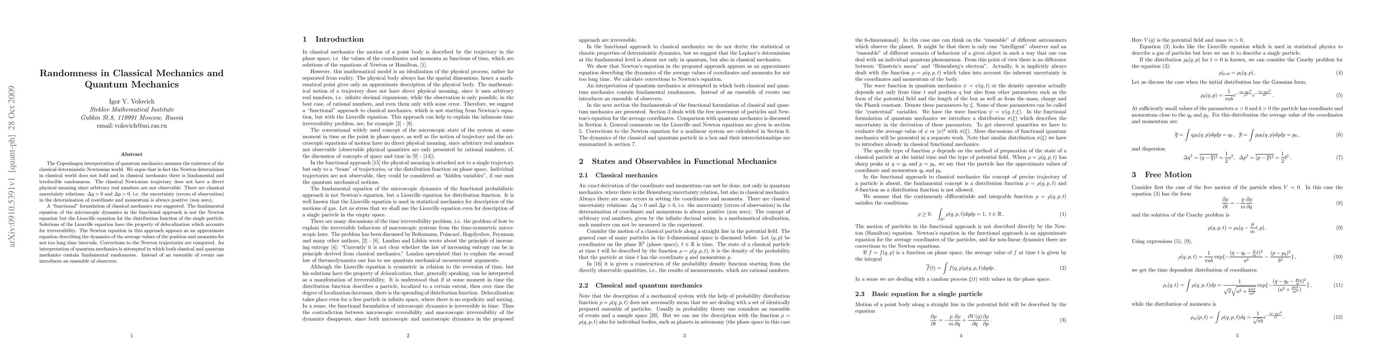 The Copenhagen interpretation of quantum mechanics assumes the existence of the classical deterministic Newtonian world. We argue that in fact the Newton determinism in classical world does not hold and in classical mechanics there is fundamental and irreducible randomness. The classical Newtonian trajectory does not have a direct physical meaning since arbitrary real numbers are not observable. There are classical uncertainty relations, i.e. the uncertainty (errors of observation) in the determination of coordinate and momentum is always positive (non zero). A "functional" formulation of classical mechanics was suggested. The fundamental equation of the microscopic dynamics in the functional approach is not the Newton equation but the Liouville equation for the distribution function of the single particle. Solutions of the Liouville equation have the property of delocalization which accounts for irreversibility. The Newton equation in this approach appears as an approximate equation describing the dynamics of the average values of the position and momenta for not too long time intervals. Corrections to the Newton trajectories are computed. An interpretation of quantum mechanics is attempted in which both classical and quantum mechanics contain fundamental randomness. Instead of an ensemble of events one introduces an ensemble of observers.