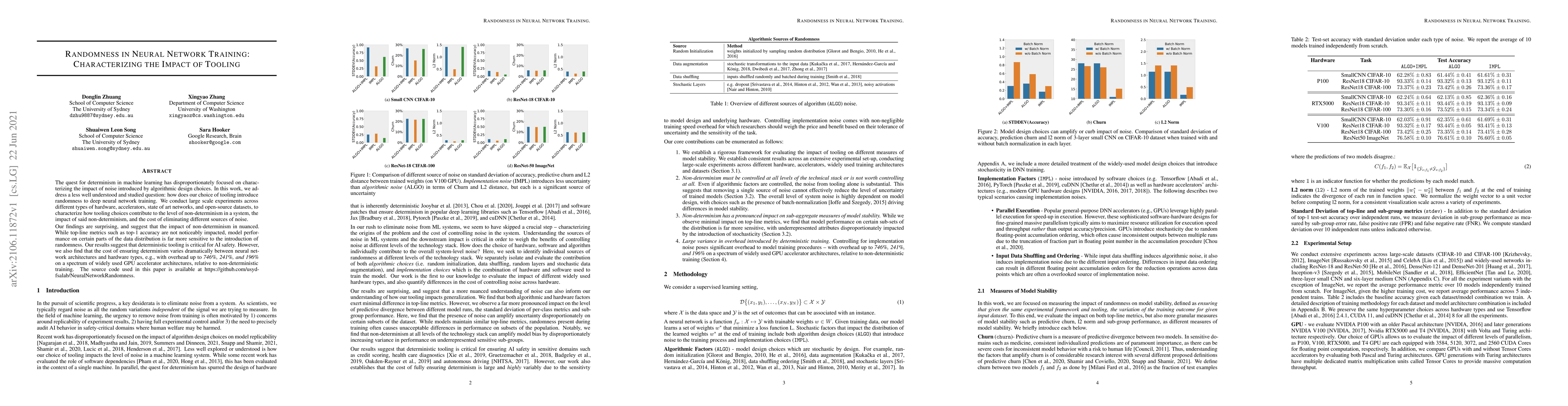 This paper investigates how tooling choices introduce randomness in neural network training, finding nuanced impacts on model performance despite stable top-level metrics. It highlights the significant cost differences in achieving determinism across various neural architectures and hardware, with overheads up to 746%.
