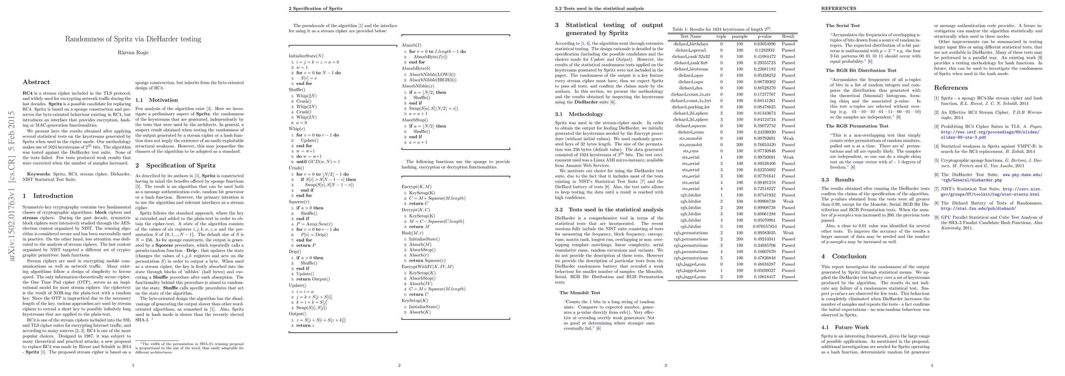 RC4 is a stream cipher included in the TLS protocol, and widely used for encrypting network traffic during the last decades. Spritz is a possible candidate for replacing RC4. Spritz is based on a sponge construction and preserves the byte-oriented behaviour existing in RC4, but introduces an interface that provides encryption, hashing or MAC-generation functionalities. We present here the results obtained after applying several statistical tests on the keystreams generated by Spritz when used in the cipher mode. Our methodology makes use of 1024 keystreams of 2^25 bits. The algorithm was tested against the DieHarder test suite. None of the tests failed. Few tests produced weak results that were corrected when the number of samples increased.