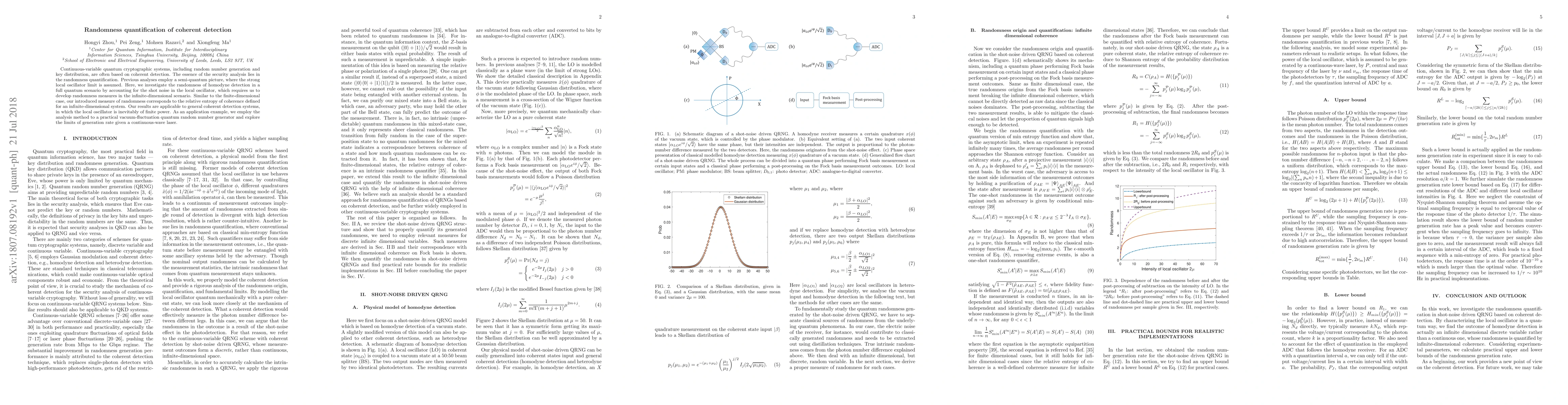 Continuous-variable quantum cryptographic systems, including random number generation and key distribution, are often based on coherent detection. The essence of the security analysis lies in the randomness quantification. Previous analyses employ a semi-quantum picture, where the strong local oscillator limit is assumed. Here, we investigate the randomness of homodyne detection in a full quantum scenario by accounting for the shot noise in the local oscillator, which requires us to develop randomness measures in the infinite-dimensional scenario. Similar to the finite-dimensional case, our introduced measure of randomness corresponds to the relative entropy of coherence defined for an infinite-dimensional system. Our results are applicable to general coherent detection systems, in which the local oscillator is inevitably of finite power. As an application example, we employ the analysis method to a practical vacuum-fluctuation quantum random number generator and explore the limits of generation rate given a continuous-wave laser.