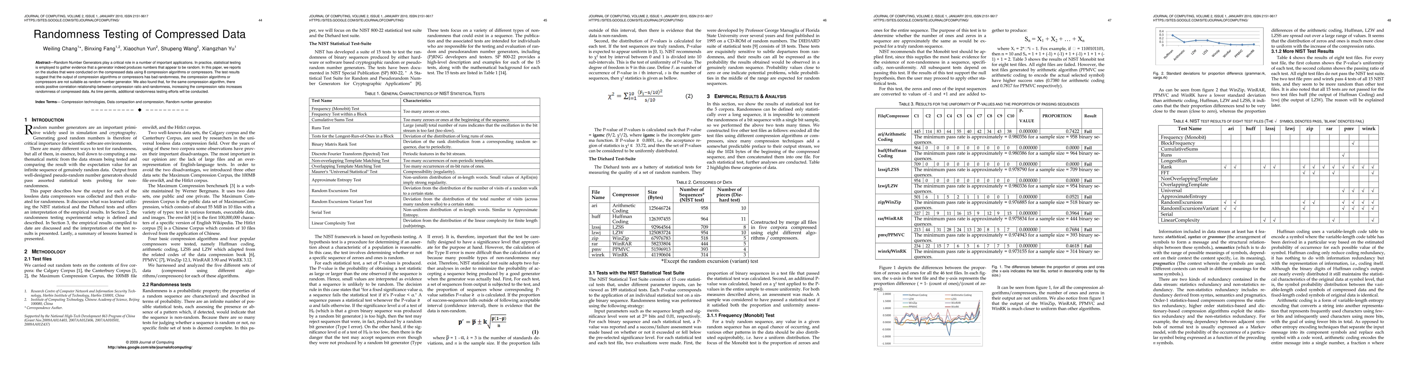 Random Number Generators play a critical role in a number of important applications. In practice, statistical testing is employed to gather evidence that a generator indeed produces numbers that appear to be random. In this paper, we reports on the studies that were conducted on the compressed data using 8 compression algorithms or compressors. The test results suggest that the output of compression algorithms or compressors has bad randomness, the compression algorithms or compressors are not suitable as random number generator. We also found that, for the same compression algorithm, there exists positive correlation relationship between compression ratio and randomness, increasing the compression ratio increases randomness of compressed data. As time permits, additional randomness testing efforts will be conducted.