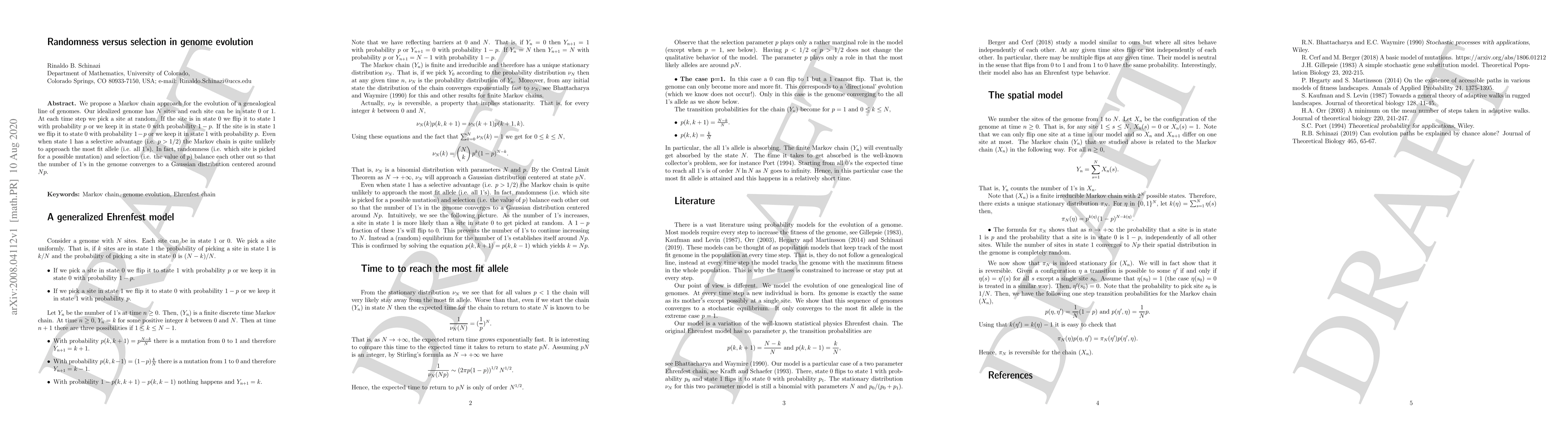 We propose a Markov chain approach for the evolution of a genealogical line of genomes. Our idealized genome has $N$ sites and each site can be in state $0$ or $1$. At each time step we pick a site at random. If the site is in state $0$ we flip it to state 1 with probability $p$ or we keep it in state $0$ with probability $1-p$. If the site is in state $1$ we flip it to state 0 with probability $1-p$ or we keep it in state $1$ with probability $p$. Even when state 1 has a selective advantage (i.e. $p>1/2$) the Markov chain is quite unlikely to approach the most fit allele (i.e. all 1's). In fact, randomness (i.e. which site is picked for a possible mutation) and selection (i.e. the value of $p$) balance each other out so that the number of $1$'s in the genome converges to a Gaussian distribution centered around $Np$.
