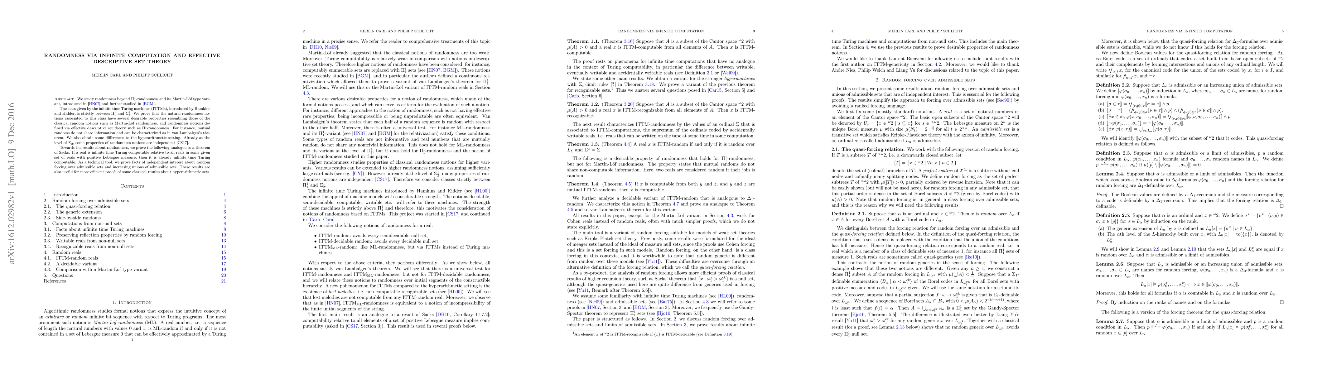 We study randomness beyond $\Pi^1_1$-randomness and its Martin-L\"of type variant, introduced in \cite{MR2340241} and further studied in \cite{Continuous-higher-randomness}. The class given by the infinite time Turing machines (\ITTM s), introduced by Hamkins and Kidder, is strictly between $\Pi^1_1$ and $\Sigma^1_2$. We prove that the natural randomness notions associated to this class have several desirable properties resembling those of the classical random notions such as Martin-L\"of randomness, and randomness notions defined via effective descriptive set theory such as $\Pi^1_1$-randomness. For instance, mutual randoms do not share information and can be characterized as in van Lambalgen's theorem. We also obtain some differences to the hyperarithmetic setting. Already at the level of $\Sigma^1_2$, some properties of randomness notions are independent \cite{Infinite-computations}. Towards the results about randomness, we prove the following analogue to a theorem of Sacks. If a real is infinite time Turing computable relative to all reals in some given set of reals with positive Lebesgue measure, then it is already infinite time Turing computable. As a technical tool, we prove facts of independent interest about random forcing over admissible sets and increasing unions of admissible sets. These results are also useful for more efficient proofs of some classical results about hyperarithmetic sets.