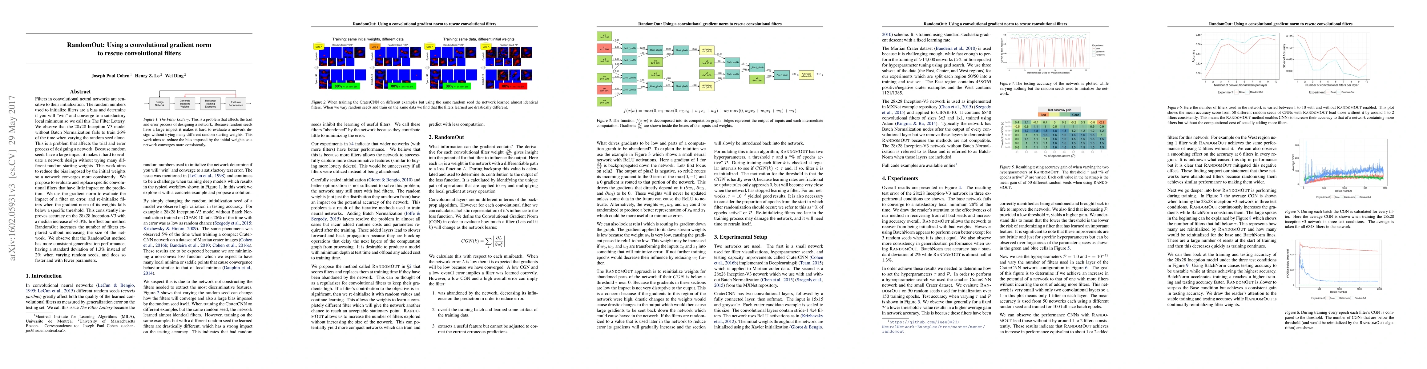 The paper proposes RandomOut, a method to mitigate the "Filter Lottery" in convolutional neural networks by re-initializing filters with low gradient norm, improving the 28x28 Inception-V3 model's accuracy by a median of +3.3% and achieving more consistent performance across different random seeds.