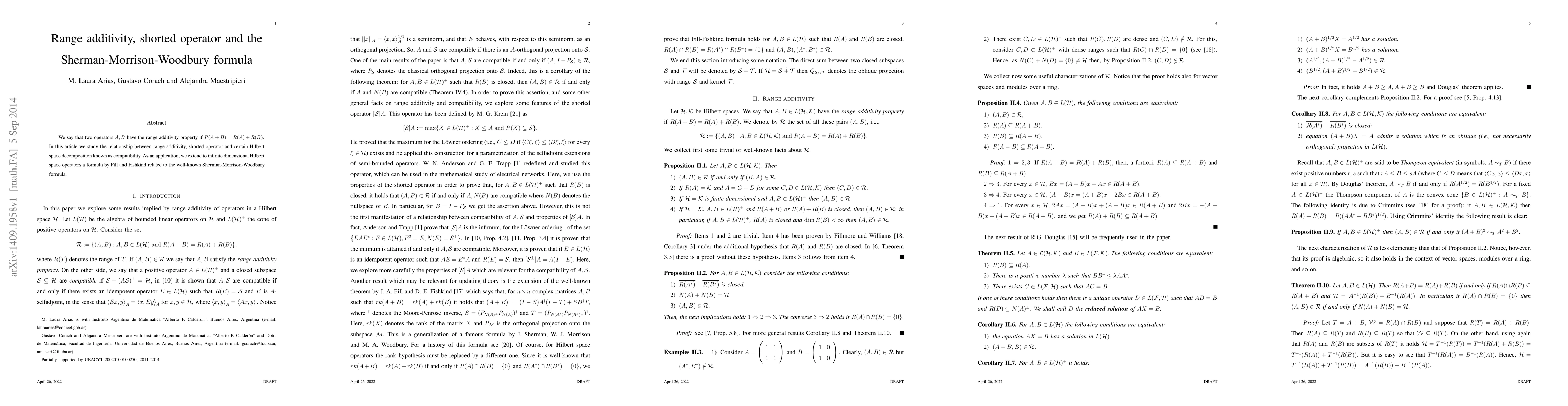 This paper investigates the range additivity property between operators and its relation to shorted operators and Hilbert space compatibility. It extends a formula by Fill and Fishkind to infinite dimensional Hilbert spaces, analogous to the Sherman-Morrison-Woodbury formula.
