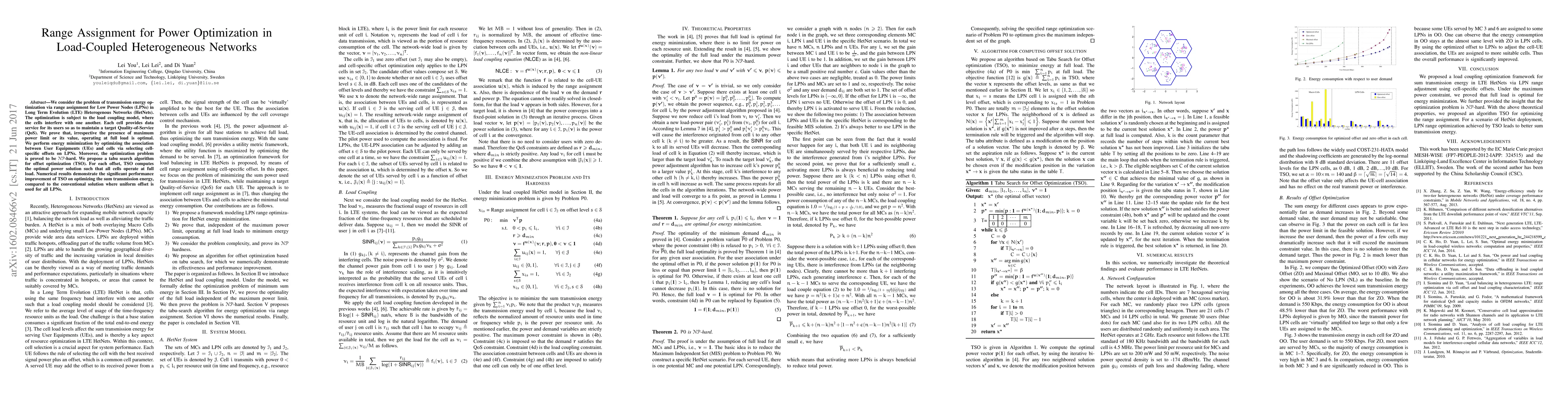 This paper addresses energy optimization via range assignment in LTE heterogeneous networks, proving that operating at full load is optimal. It proposes a tabu search algorithm for optimizing cell-specific offsets on low power nodes, demonstrating significant improvements over conventional uniform offset methods.