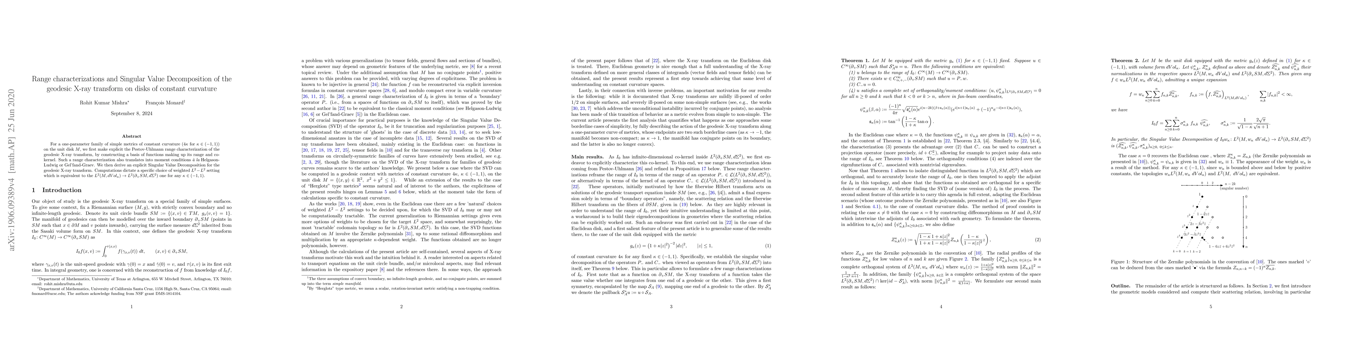 For a one-parameter family of simple metrics of constant curvature ($4\kappa$ for $\kappa\in (-1,1)$) on the unit disk $M$, we first make explicit the Pestov-Uhlmann range characterization of the geodesic X-ray transform, by constructing a basis of functions making up its range and co-kernel. Such a range characterization also translates into moment conditions {\it \`a la} Helgason-Ludwig or Gel'fand-Graev. We then derive an explicit Singular Value Decomposition for the geodesic X-ray transform. Computations dictate a specific choice of weighted $L^2-L^2$ setting which is equivalent to the $L^2(M, dVol_\kappa)\to L^2(\partial_+ SM, d\Sigma^2)$ one for any $\kappa\in (-1,1)$.