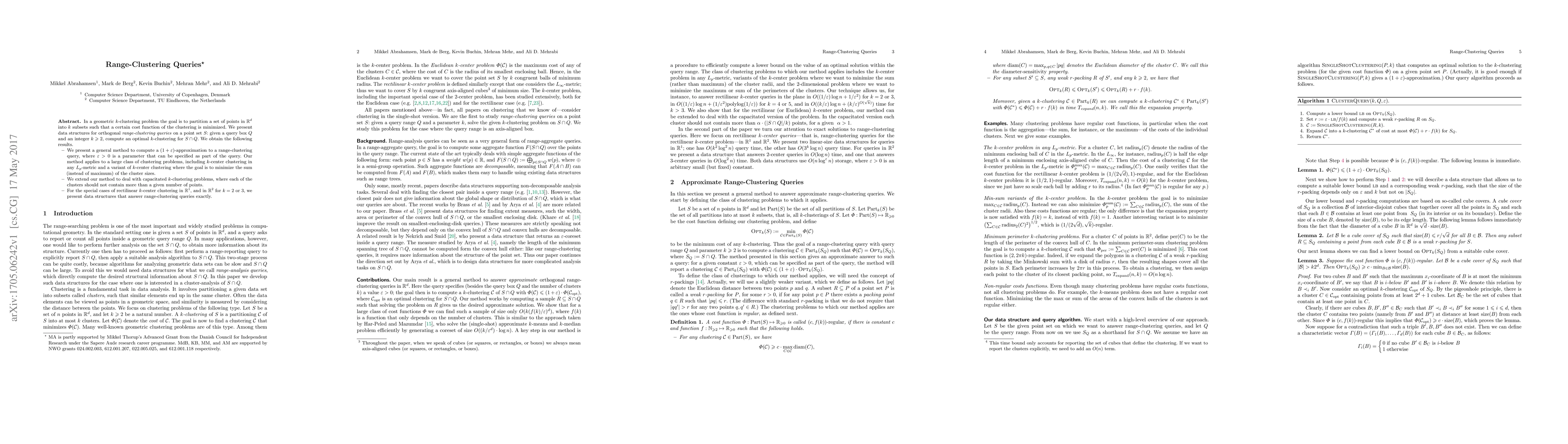 This paper presents data structures for efficiently solving range-clustering queries, providing $(1+\epsilon)$-approximations for various clustering problems, including $k$-center clustering in $L_p$-metrics. Exact solutions are also offered for specific cases like rectilinear $k$-center clustering in $\mathbb{R}^1$ and $\mathbb{R}^2$ for $k=2$ or $3$.