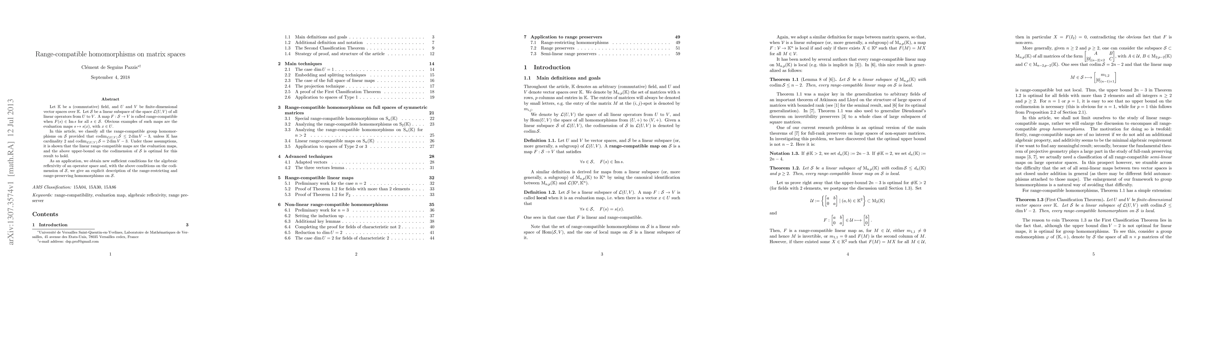 This paper classifies all range-compatible group homomorphisms on a linear subspace S of L(U,V) under the condition that the codimension of S is less than or equal to 2 dim(V)-3, showing that linear range-compatible maps are evaluation maps. It also provides new conditions for algebraic reflexivity of operator spaces and describes range-restricting and range-preserving homomorphisms.