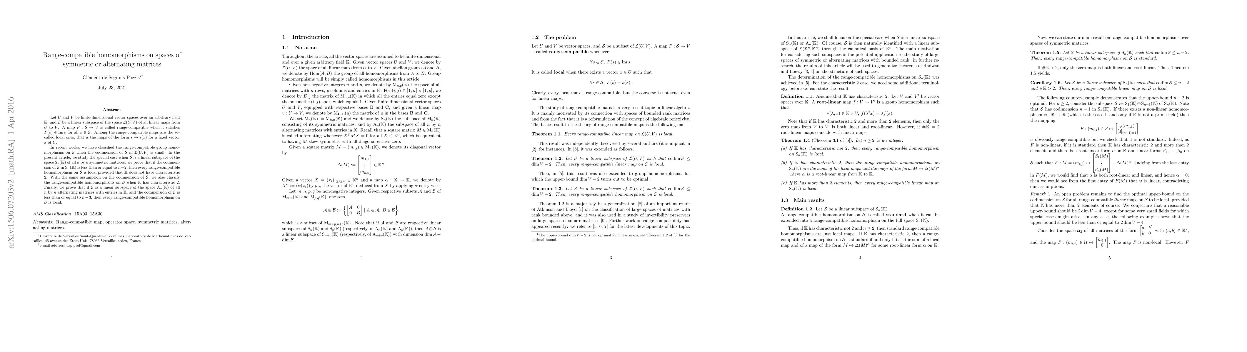 This paper classifies range-compatible homomorphisms on subspaces of symmetric and alternating matrices, proving that such homomorphisms are local under certain codimension conditions, especially when the base field does not have characteristic 2. It also addresses the case when the field has characteristic 2.