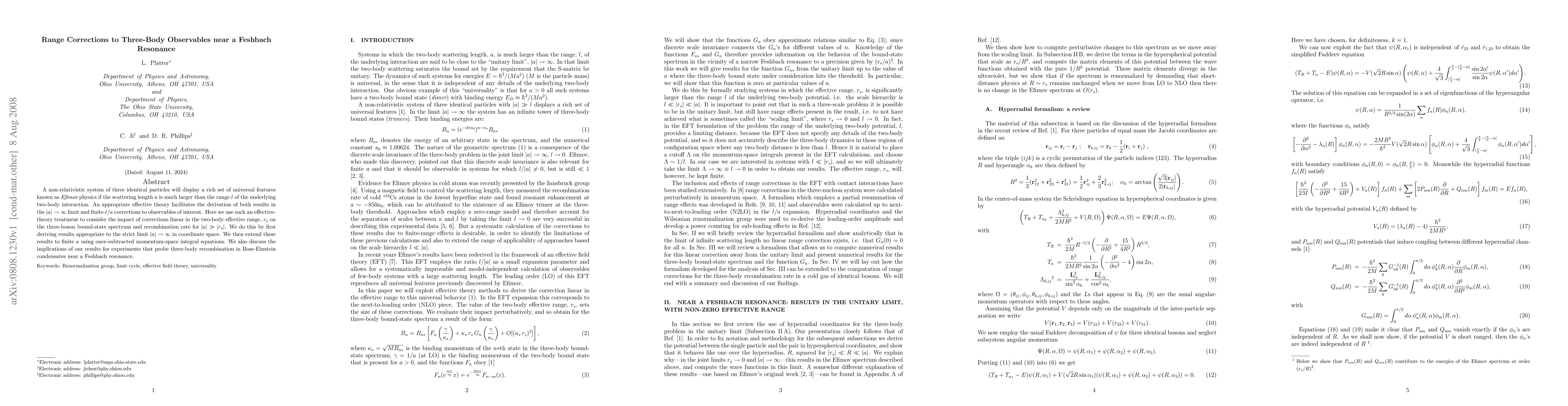 Researchers used an effective theory to study corrections to three-boson bound-state spectrum and recombination rate near a Feshbach resonance, finding linear effects in the two-body range with |a| much greater than |r_s|. The results have implications for experiments probing three-body recombination in Bose-Einstein condensates.