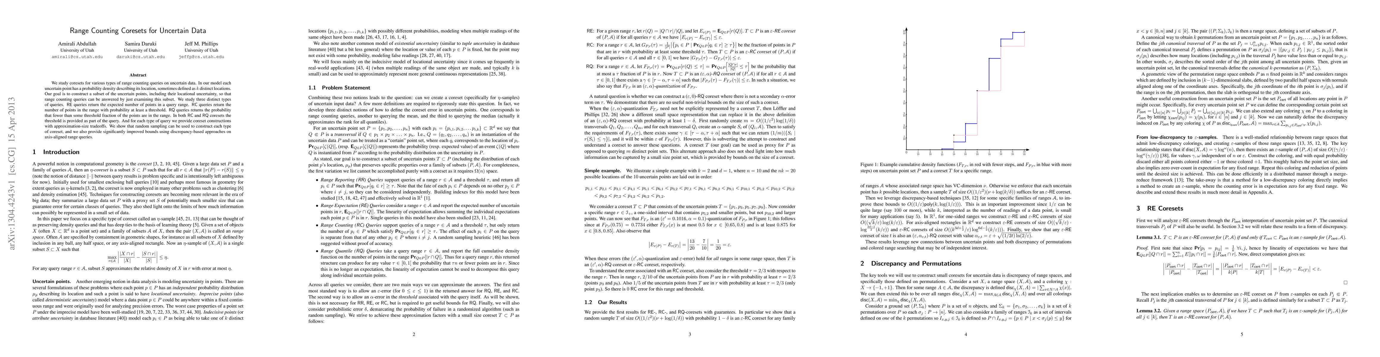 This paper develops coresets for range counting queries on uncertain data, improving bounds using discrepancy-based approaches and demonstrating the effectiveness of random sampling and other methods.