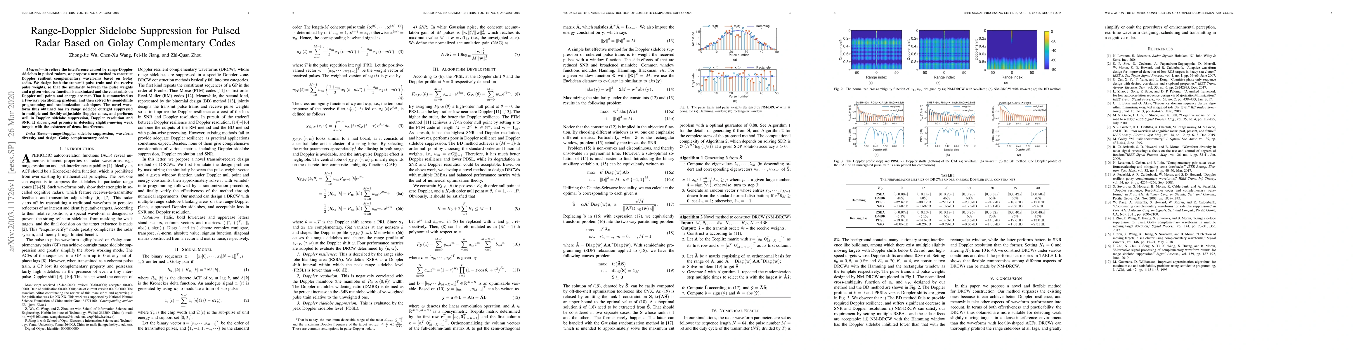 This paper proposes a method using Golay complementary codes to construct Doppler resilient waveforms for pulsed radars, achieving effective suppression of range-Doppler sidelobes through optimization techniques. The designed waveforms show improved performance in sidelobe suppression, Doppler resolution, and SNR, enhancing the detection of weak targets amidst dense interference.