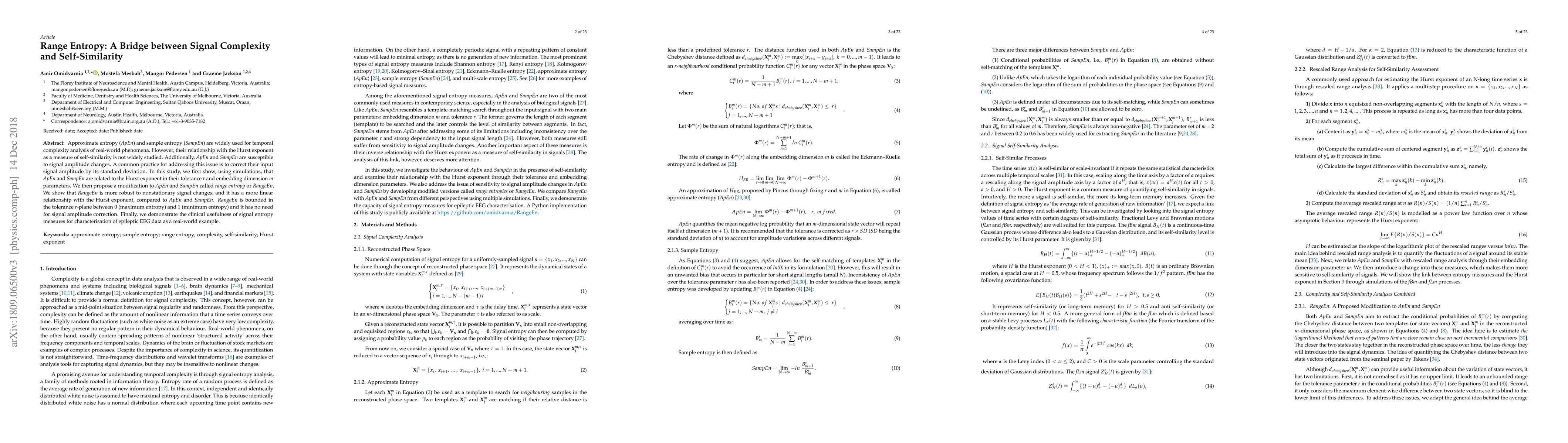Approximate entropy (ApEn) and sample entropy (SampEn) are widely used for temporal complexity analysis of real-world phenomena. However, their relationship with the Hurst exponent as a measure of self-similarity is not widely studied. Additionally, ApEn and SampEn are susceptible to signal amplitude changes. A common practice for addressing this issue is to correct their input signal amplitude by its standard deviation. In this study, we first show, using simulations, that ApEn and SampEn are related to the Hurst exponent in their tolerance r and embedding dimension m parameters. We then propose a modification to ApEn and SampEn called range entropy or RangeEn. We show that RangeEn is more robust to nonstationary signal changes, and it has a more linear relationship with the Hurst exponent, compared to ApEn and SampEn. RangeEn is bounded in the tolerance r-plane between 0 (maximum entropy) and 1 (minimum entropy) and it has no need for signal amplitude correction. Finally, we demonstrate the clinical usefulness of signal entropy measures for characterisation of epileptic EEG data as a real-world example.